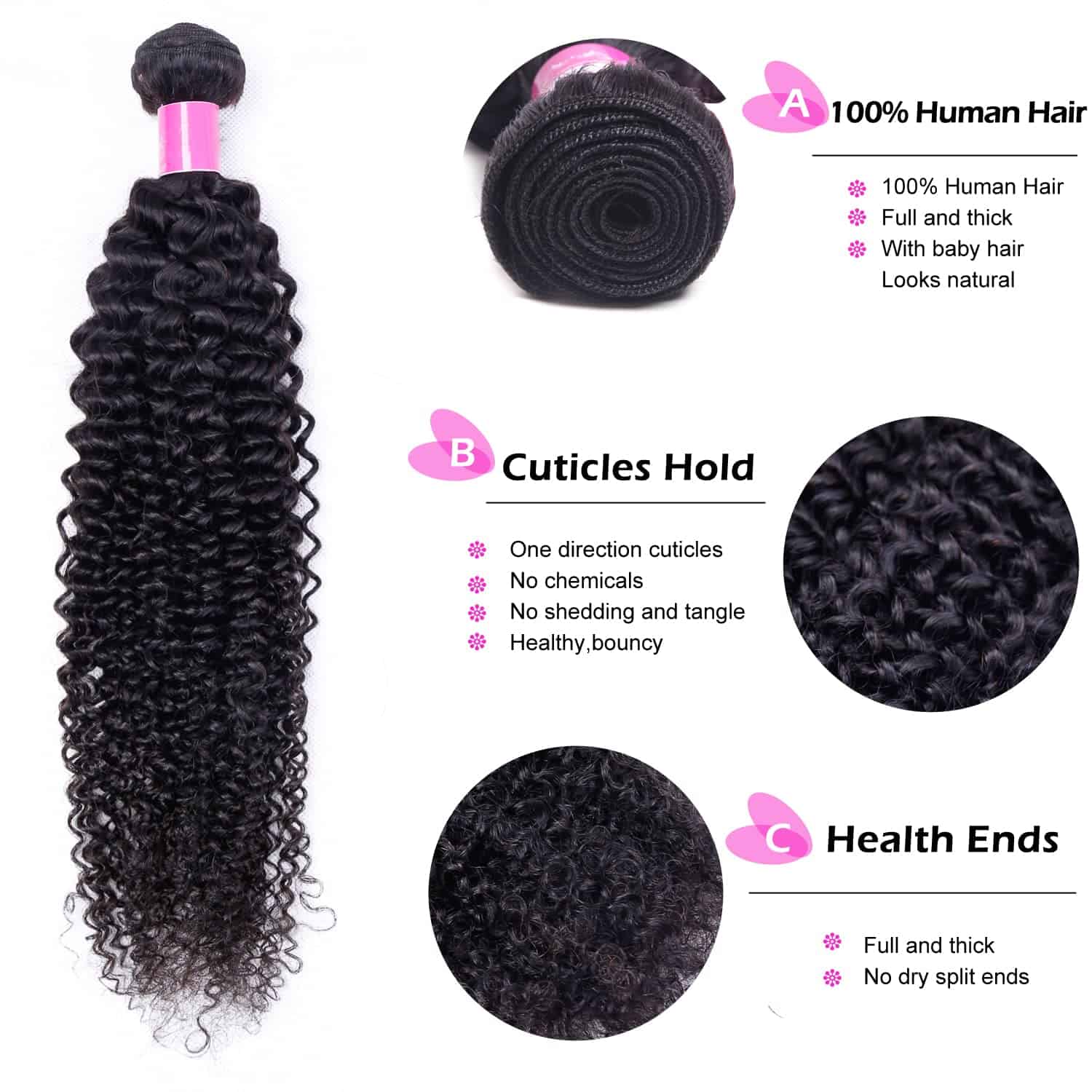 1. Material del Cabello: 100% Cabello Humano sin Procesar, Grado 10A Kinky Curly Human Hair Bundle Peruano.