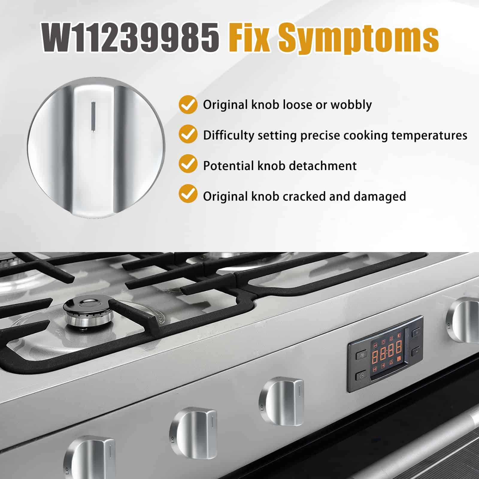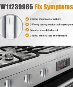 4. Síntomas que se pueden solucionar: La perilla de control de rangos de gas W11239985 puede ayudar a solucionar los siguientes síntomas: perilla original suelta o tambaleante, dificultad para ajustar temperaturas de cocción precisas, posible desprendimiento de la perilla.