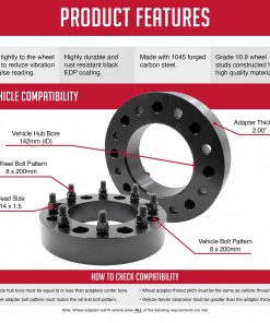 Nuestro espaciador adaptador proporciona un ajuste preciso a tu vehículo. Este espaciador es para un diámetro de cubo de rueda de 142mm, compatible solo con vehículos de doble rueda trasera. La rueda delantera no es céntrica con el cubo y la rueda trasera es centrada en el cubo. Nuestros espaciadores están fabricados en Acero Forjado 1045 y están recubiertos con un revestimiento negro resistente a la corrosión. Los pernos son SAE 10.9. Las máquinas CNC garantizan un ajuste preciso a tu vehículo.