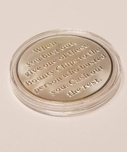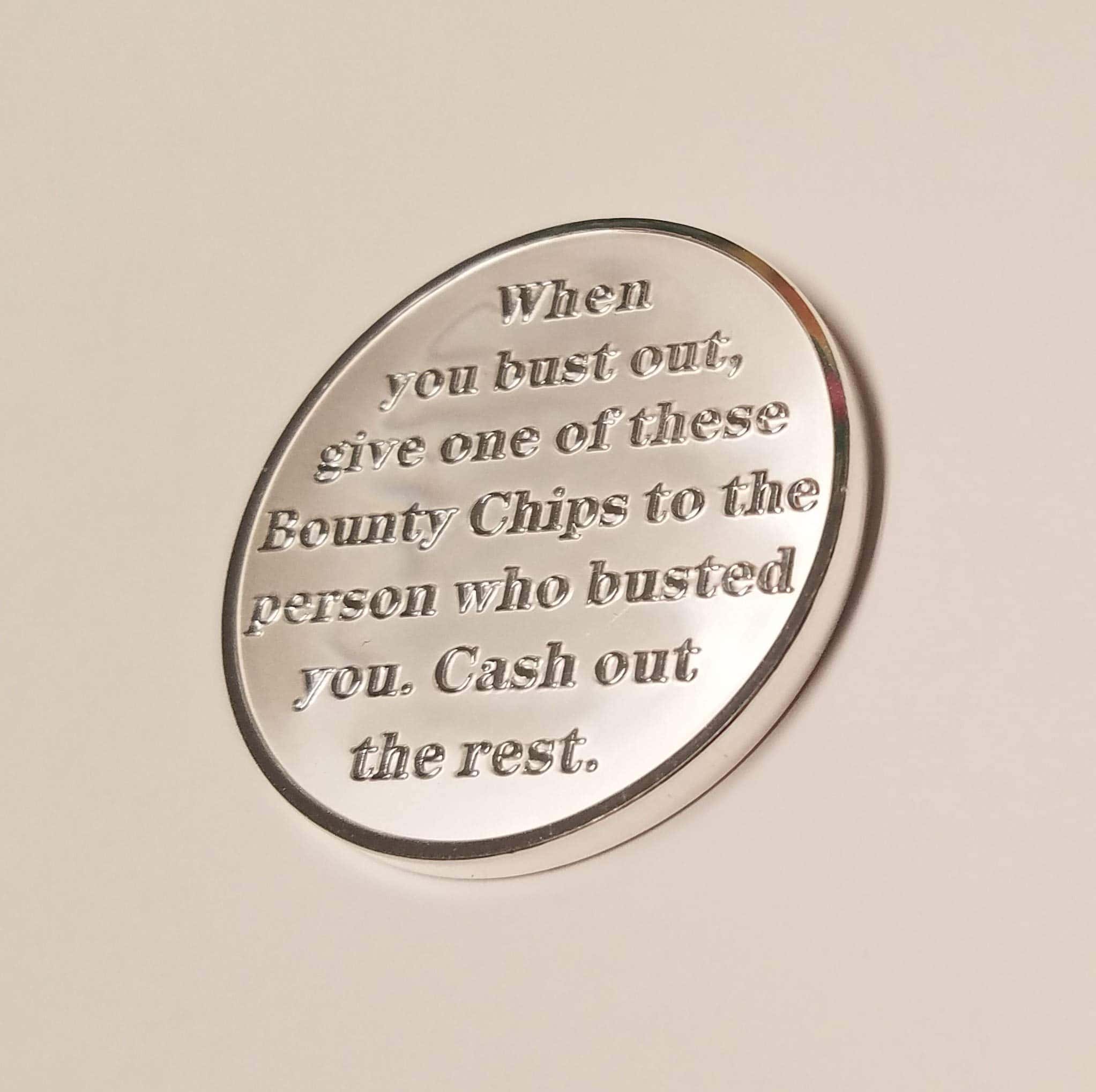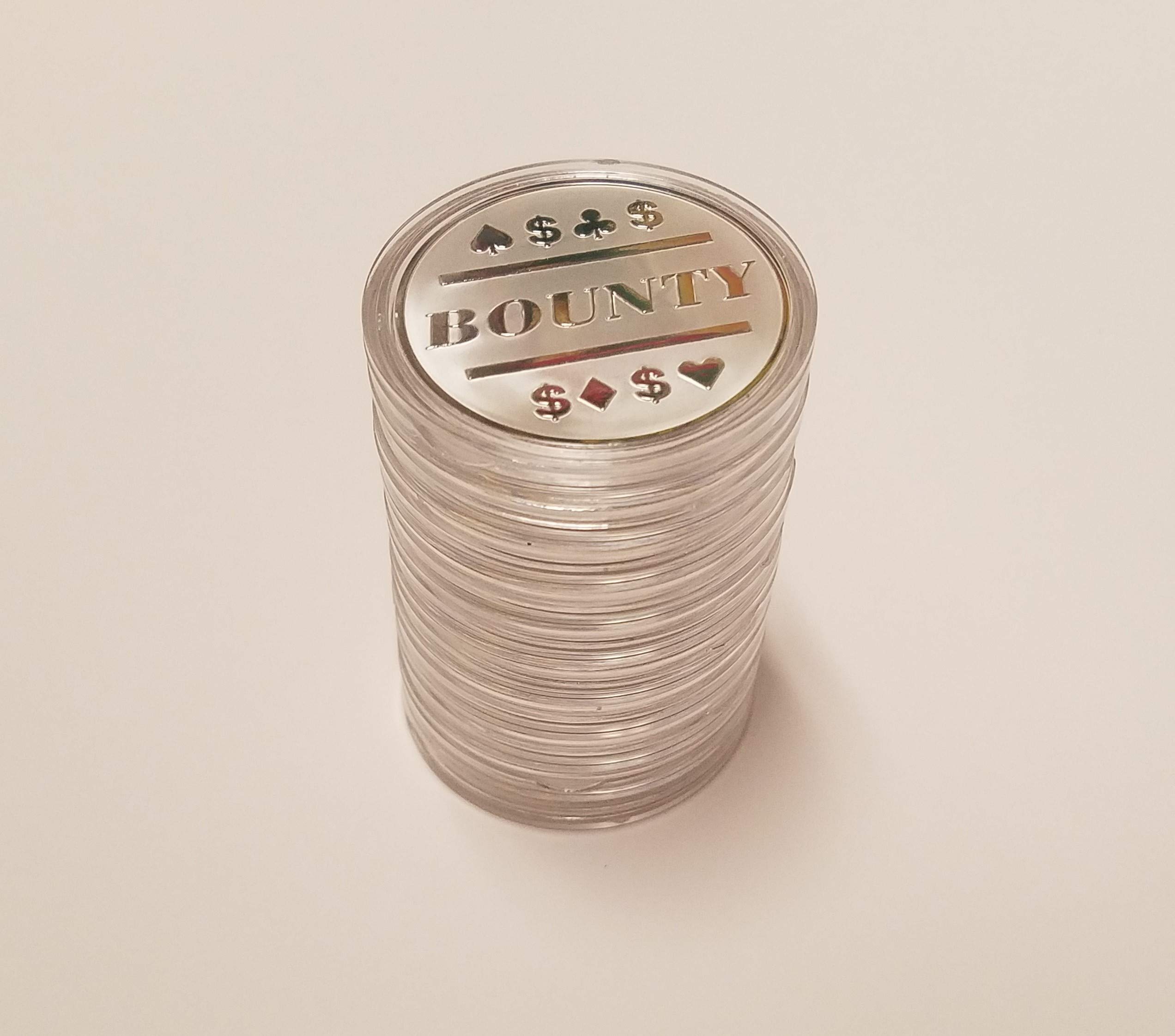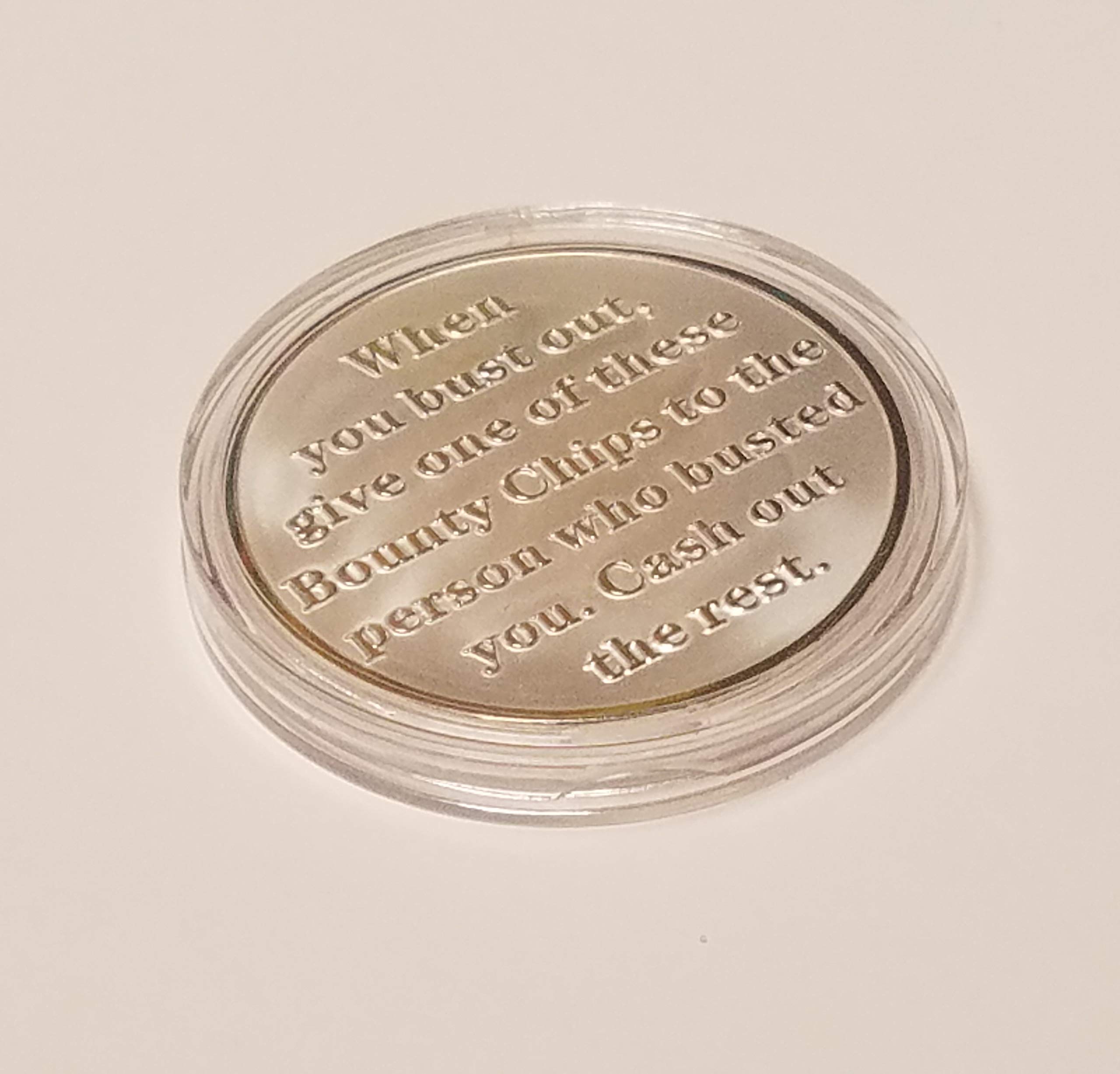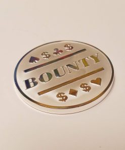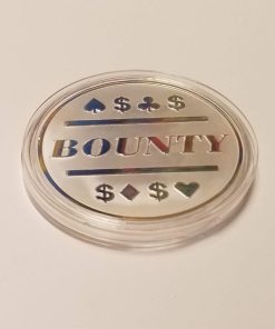 10 fichas de Poker de Bounty recubiertas en plata. Este producto facilita la organización de tu Torneo de Poker de Bounty. Cada jugador comienza con una de estas fichas y, al ser eliminado, debe entregar una de sus fichas de Bounty a la persona que lo eliminó y luego llevar el resto al director del torneo para cobrar. Esto se detalla de forma sencilla en la parte trasera de la ficha: «Cuando te eliminen, entrega una de estas Fichas de Bounty a la persona que te ha eliminado. Cobra el resto.» No se incluyen fichas de Poker o cartas adicionales aparte de las Fichas de Bounty.