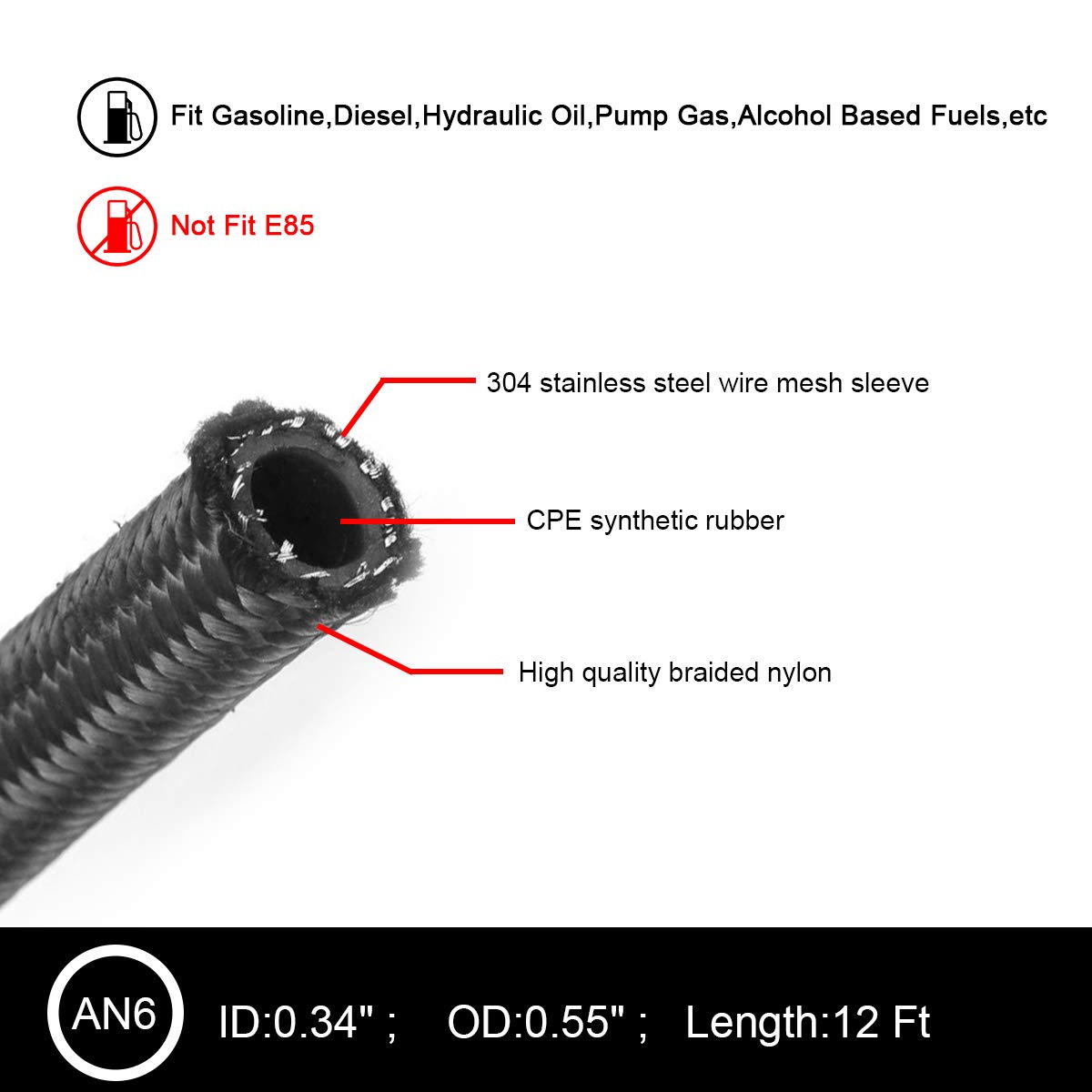 La manguera de combustible de 12 pies y 6AN 3/8″ cuenta con una construcción trenzada de acero inoxidable que proporciona resistencia y durabilidad. El kit incluye varios extremos de manguera giratorios AN-6 y adaptadores de tanque de combustible de AN-10 a AN-6 para una instalación sencilla y versátil. Es adecuado para una variedad de aplicaciones, como combustible, lubricante, alcohol, etanol, refrigerante y aire, siendo ideal para automóviles de carreras y motos de competición. La manguera tiene un tamaño de AN 6 con longitud de 3.6 metros y una tolerancia a la presión de 1500 PSI. Fabricada con material de aleación de aluminio T7 y nailon en color negro. Nota: Este producto no es legal en California y Nueva York y no cumple con las regulaciones de la C.A.R.B.