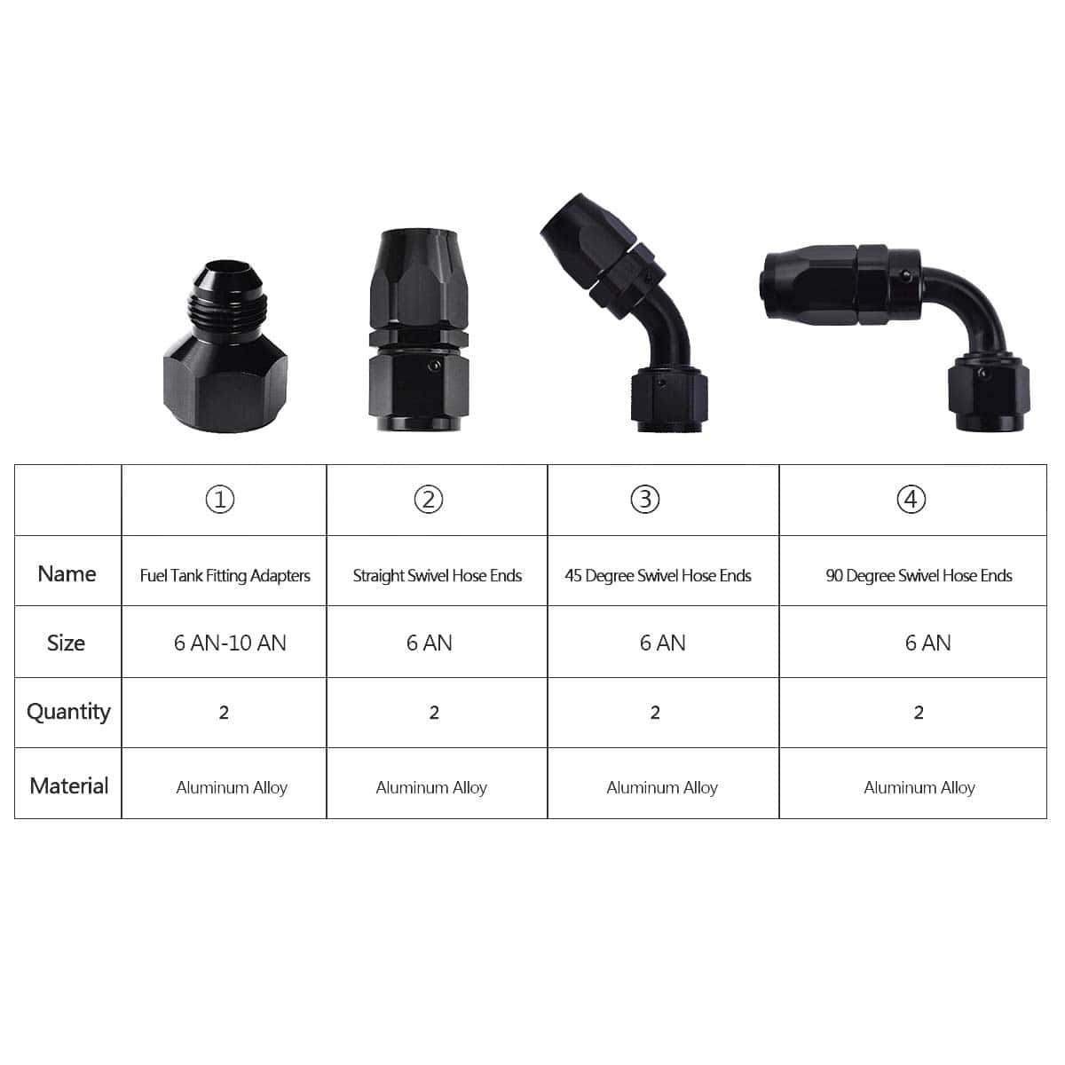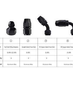 4. Extremos de Manguera de Combustible: Tamaño (ID): AN 6, Material: Aleación de Aluminio T7, Color: Negro.
