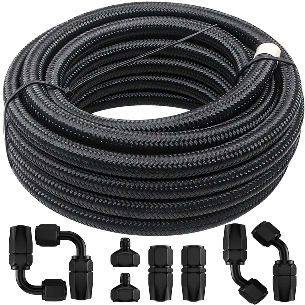 1. Paquete Incluye: 1 x Manguera Trenzada AN-6 de 12ft, 2 x Extremos de Manguera Giratorios Rectos AN-6, 2 x Extremos de Manguera Giratorios de 45 Grados AN-6, 2 x Extremos de Manguera Giratorios de 90 Grados AN-6, 2 x Adaptadores de Tanque de Combustible de AN-10 a AN-6.