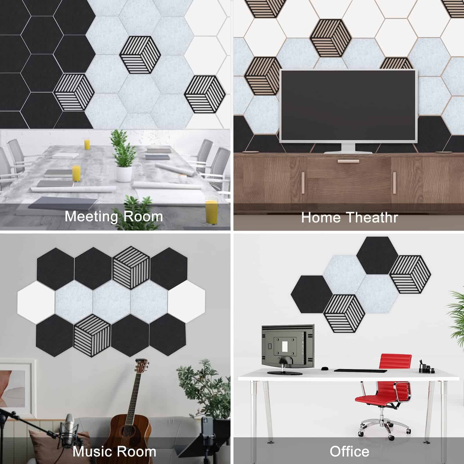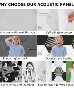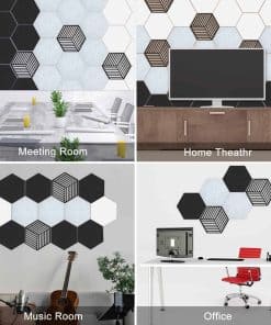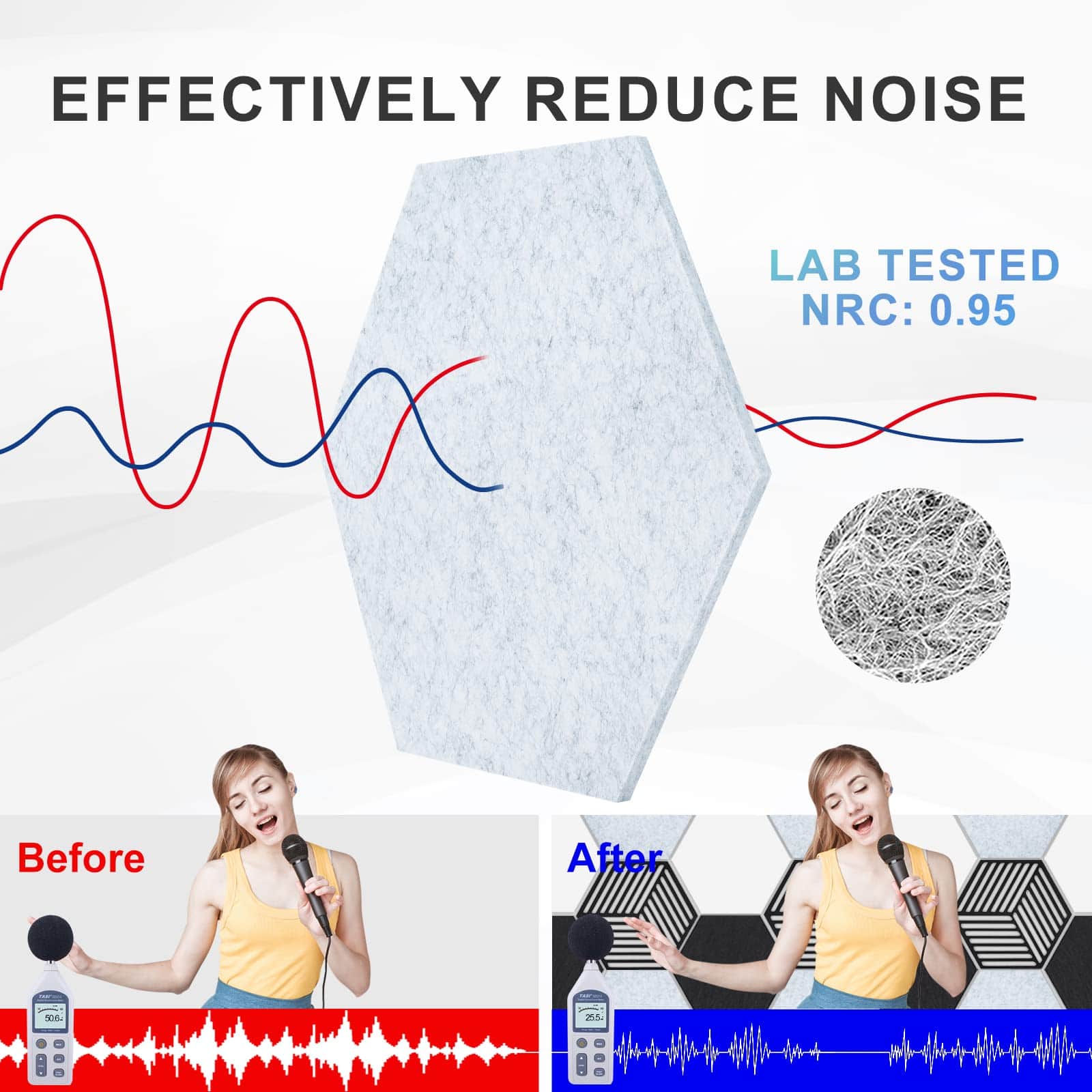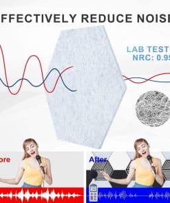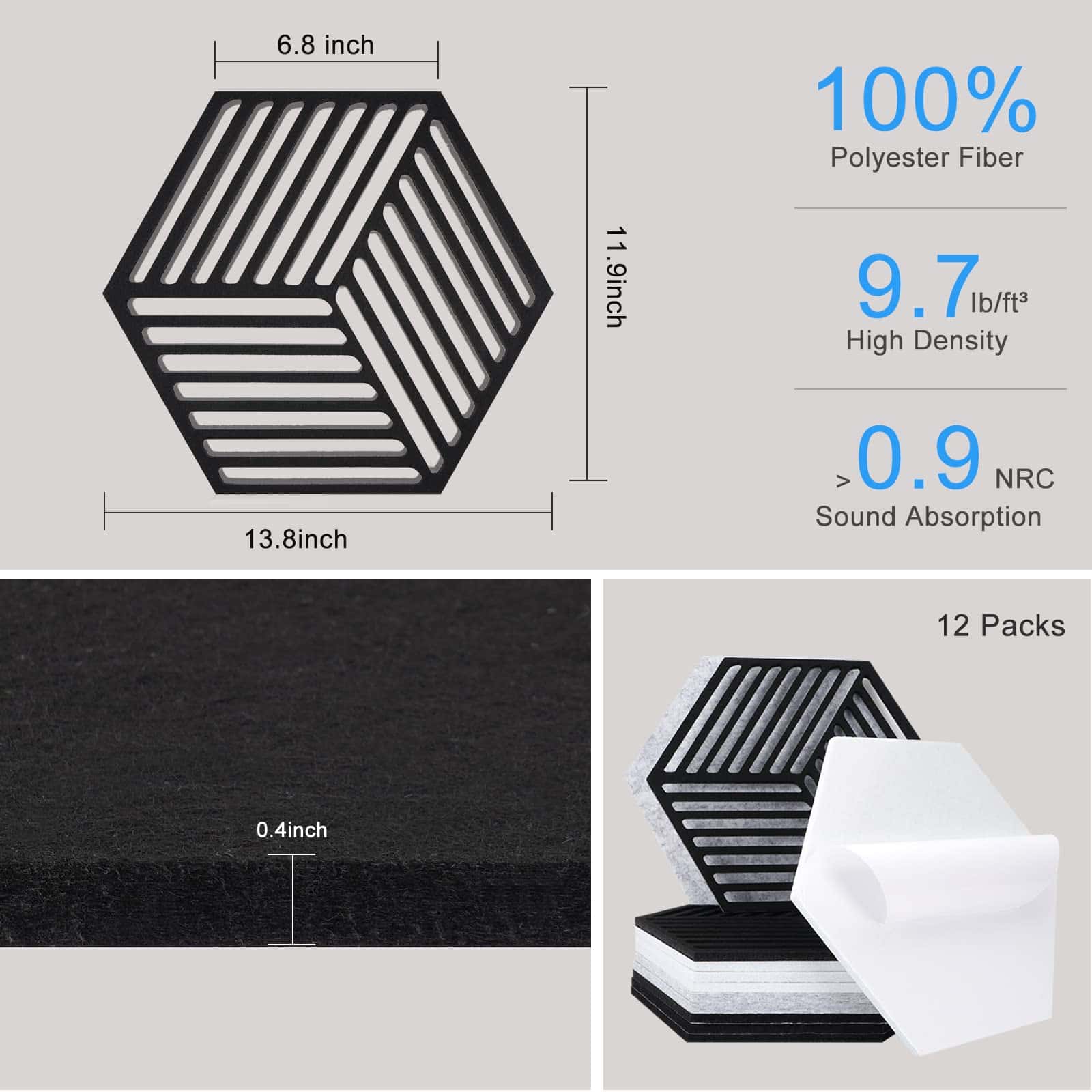 12 Pack Paneles Acústicos Autoadhesivos, Hexagonales, 14 X 12 X 0.4 Pulgadas, Paneles a Prueba de Fuego de Alta Densidad para Estudio de Grabación, Oficina. Estos paneles acústicos hexagonales únicos vienen con las combinaciones de colores más populares. Cada set incluye 2 paneles de aislamiento acústico con aberturas huecas que los hacen más decorativos. Y el gran tamaño de 14 X 12 X 0.4 pulgadas mejora el aislamiento acústico. Cuentan con una pestaña autoadhesiva que cubre toda la parte posterior y se adhiere fácilmente a cualquier superficie. No se necesitan herramientas o materiales especiales para la instalación. Puedes cortar los paneles de sonido con un cuchillo afilado para crear diferentes diseños con los paneles individuales. Los paneles acústicos con una densidad de 9.7 lb/ft pueden absorber eficazmente la reverberación, los ecos de fluter, las reflexiones acústicas no deseadas, los ruidos no deseados y reducir las ondas. Son perfectos para salas de juegos, salas de ensayo, salas de conciertos, salas de cine en casa, etc. Además de utilizar los paneles a prueba de sonido en las paredes para atenuar el sonido, también puedes utilizarlos para mejorar la acústica en una habitación, como en un estudio de grabación. Nuestros paneles de aislamiento acústico están hechos de material de fibra de poliéster de alta densidad, lo que garantiza un coeficiente de reducción de ruido: 0.92 y un coeficiente de absorción: 0.8! Además de resistencia al desgaste y resistencia a los arañazos, son inodoros, no tóxicos, sin formaldehído y retardantes de llama, lo que es seguro para respirar y tocar. Nuestro set de paneles acústicos es de alta calidad y es la mejor elección. Si tienes algún problema, no dudes en contactarnos. Y si no estás 100% satisfecho con nuestros paneles acústicos, te prometemos un reembolso del 100% o su reemplazo. ¡Tu satisfacción es nuestra prioridad!