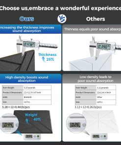 Este paquete de 12 paneles de pared insonorizante autoadhesivos es la solución perfecta para mejorar la acústica de su espacio. Construidos con poliéster de alta calidad, son inodoros y retardantes de llama, lo que garantiza su seguridad y durabilidad. Los paneles tienen un grosor de 0.47 pulgadas y una densidad de 1.2lb/ft�, lo que los hace un 25% más gruesos y un 35% más densos que los paneles tradicionales, ofreciendo una mayor eficacia en la absorción del sonido y evitando deformaciones a largo plazo.