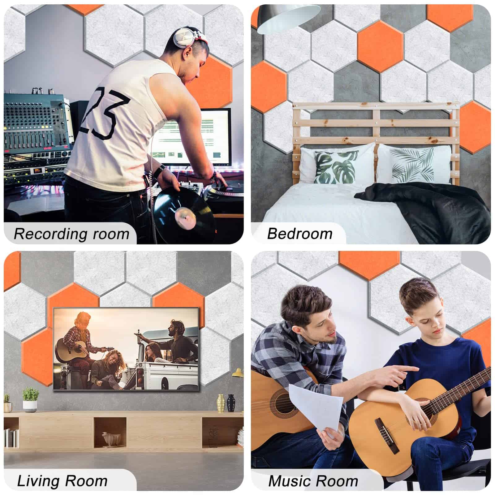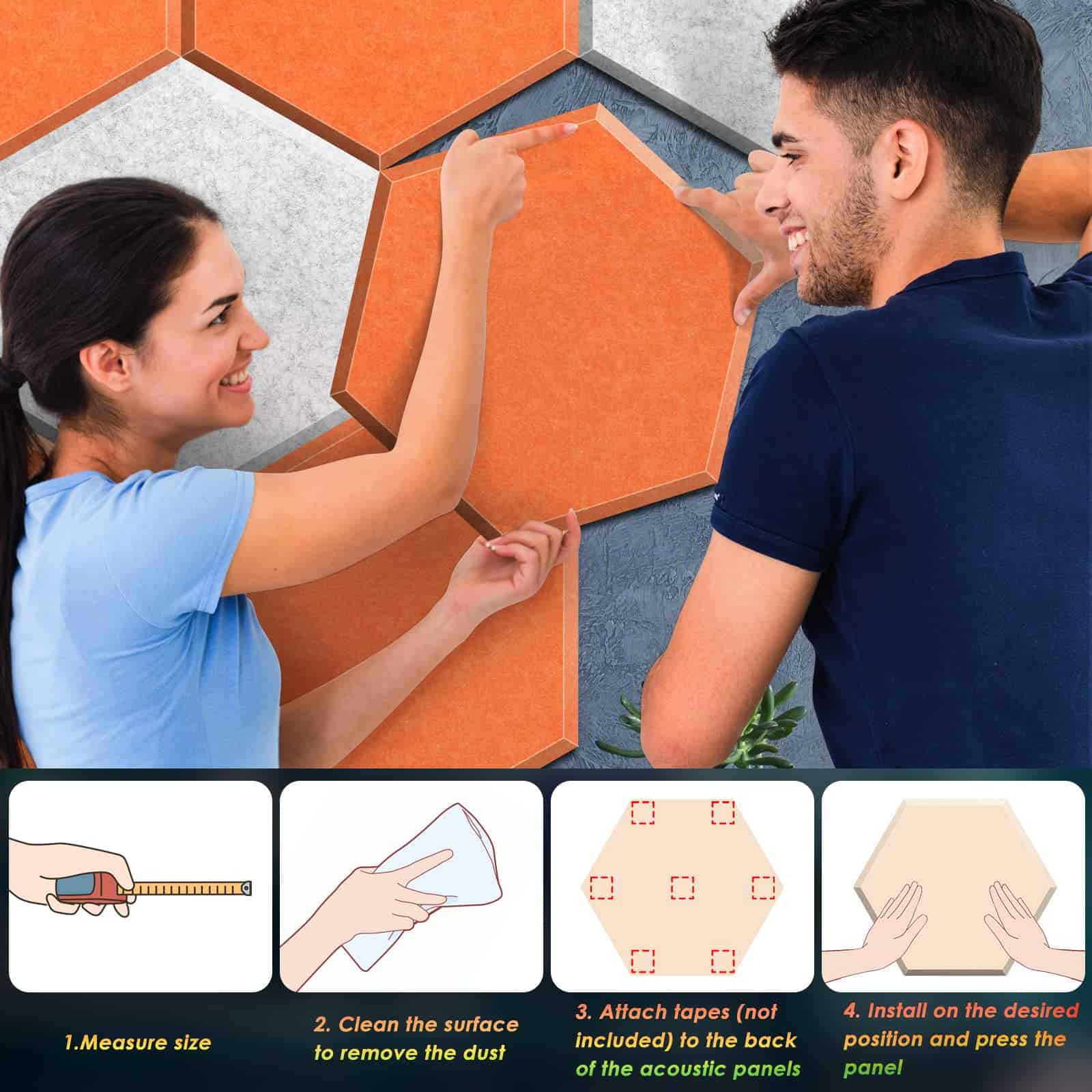 Fáciles de instalar, los paneles acústicos se pueden cortar a medida y colocar con cintas adhesivas en superficies lisas. Hechos de tela de fieltro de poliéster de alta densidad, estos paneles ofrecen una excelente atenuación del ruido, eliminando impurezas sonoras y mejorando la inteligibilidad del habla. Además, su diseño en forma de hexágono y borde biselado proporciona protección adicional contra colisiones, arañazos y deslizamientos.