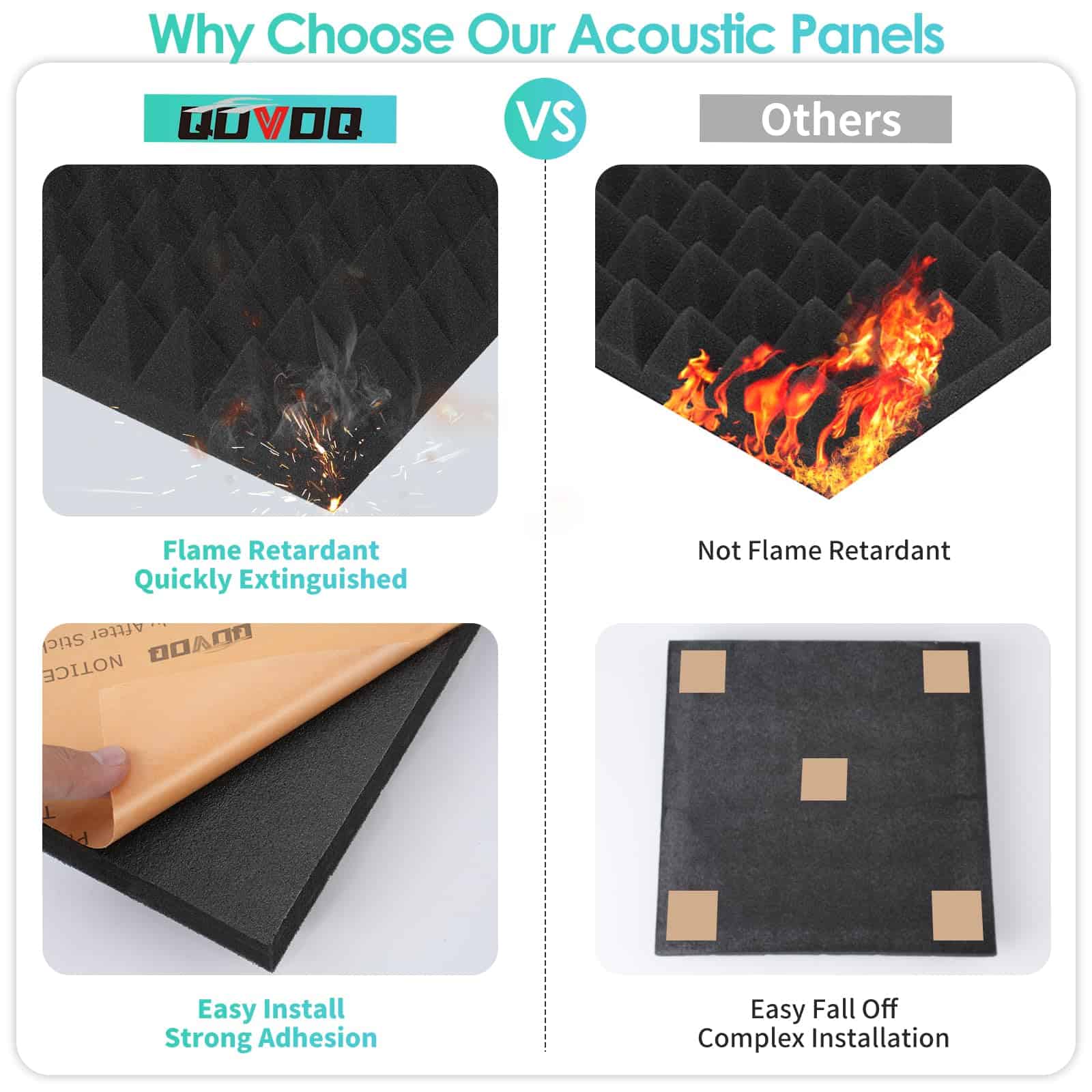 5. Garantía de Calidad y Servicio: Cada uno de nuestros paneles de amortiguación de sonido QDVDQ ha pasado por una estricta inspección de calidad antes de salir de fábrica. Si encuentras algún problema de calidad con los tableros de espuma acústica, no dudes en contactarnos. Te responderemos en un plazo de 24 horas y te daremos una solución satisfactoria. Tus sugerencias son nuestro apoyo.