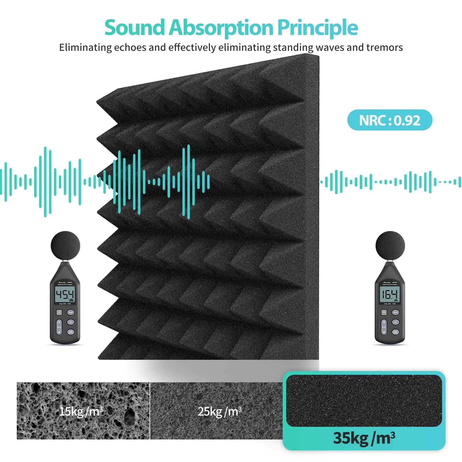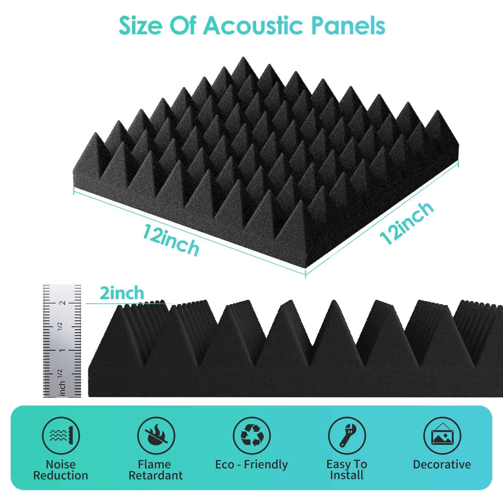 1. Excelente Absorción de Sonido: Los paneles de pared insonorizantes adoptan un diseño acústico piramidal 3D único, que no solo aumenta el área de contacto con el sonido, sino que también absorbe frecuencias más bajas para controlar y capturar los graves. Hay dos espesores de espuma acústica, 1 pulgada y 2 pulgadas, puedes elegir libremente según tus necesidades.