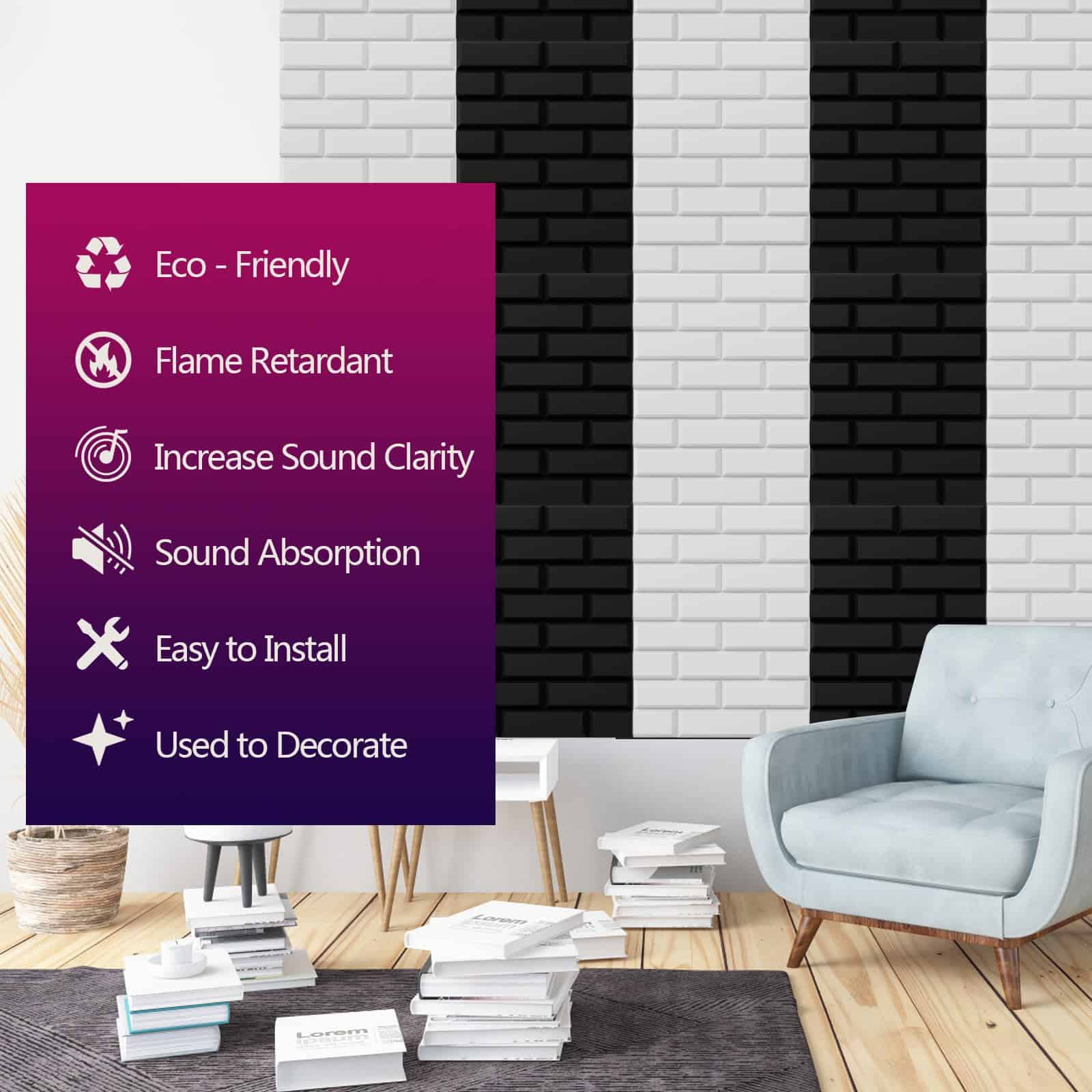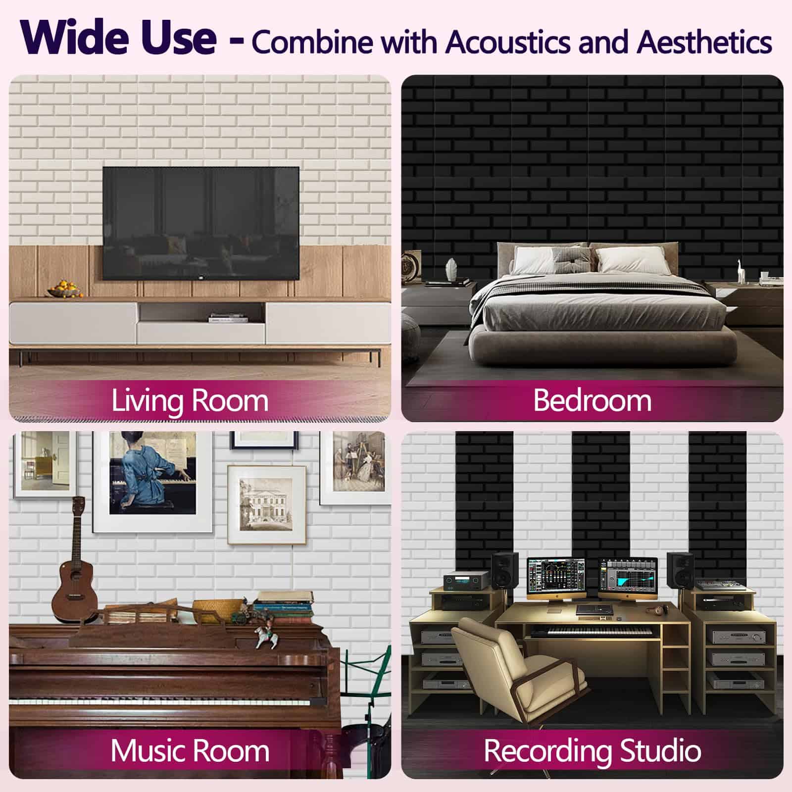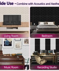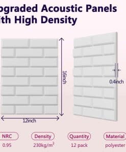 1. ÁREA ACTUALIZADA Nuestro panel acústico rectangular tiene un área de absorción de sonido extra grande, brindando una mejor cobertura para tu espacio. Absorbe el ruido innecesario mientras juega un buen papel en decorar la superficie de la pared. 2. MATERIAL SEGURO Hecho de fibra de poliéster 100%, son inodoros y retardantes de fuego de clase B1. No hay ningún riesgo cuando permaneces en una habitación con nuestros paneles de absorción de sonido por mucho tiempo. Además, el producto es fácil de instalar y puede adaptarse a diferentes superficies como paredes, techos y puertas. 3. CARACTERÍSTICAS ACÚSTICAS Nuestros paneles insonorizantes ayudan a reducir el sonido no deseado reflejado en cualquier habitación de tu hogar o edificio. Son livianos y fáciles de montar en la pared, puertas y techo. Ayudan a reducir el ruido de fondo, ecos, tiempo de reverberación (RT) y disminuyen las ondas estacionarias (que es lo que hace tan malos a los estudios ruidosos u oficinas). 4. AMPLIO USO Estos paneles absorbentes de sonido pueden absorber bien el eco y el ruido, mejorando efectivamente tu entorno y calidad sonora, como en estudios en casa, gimnasios, salas de juegos, salas de computadoras, lugares de filmación de video, salas de ensayo, salas de conciertos, estudios de grabación, escuelas, salas de conferencias, teatros en casa, oficinas y más. 5. Fácil de instalar y cortable El panel de sonido cuenta con un diseño autoadhesivo que no requiere herramientas o materiales adicionales para instalar. Además, los paneles acústicos artísticos de patrón de ladrillo se pueden cortar fácilmente en la forma y tamaño deseado, lo que lo hace ideal para varios proyectos de bricolaje.