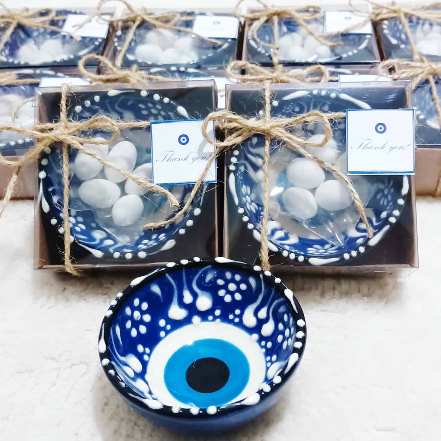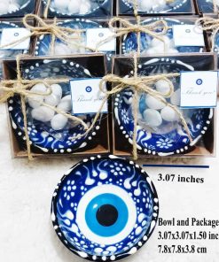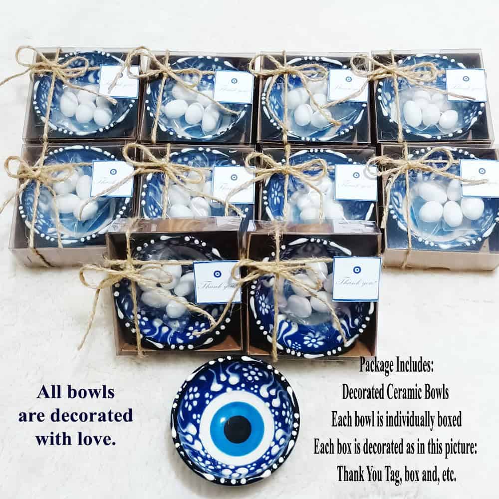 3. PAQUETE INCLUYE: Los tazones de cerámica ojo turco están listos para sus invitados como un producto terminado decorado. Todos los tazones vendrán en cajas decoradas individualmente. Cada paquete incluye un llavero de oso de peluche como regalo.