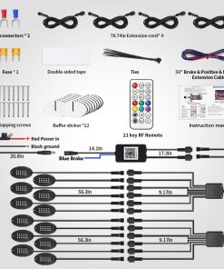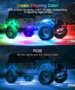 Cada luz de roca LED para Jeep de LD DARKEAGLE cuenta con 18 chips LED SMD 5050 de alta intensidad, que ofrecen colores vivos y un amplio rango de iluminación. Esto crea un efecto de iluminación único debajo del vehículo y debajo de las ruedas, mejorando el atractivo visual del exterior de su vehículo. También proporciona iluminación adicional para aventuras al aire libre, conducción todoterreno o condiciones de poca luz, haciendo que su vehículo se destaque. Las nuevas luces de roca LED cuentan con 216 LEDs de alta luminosidad + blanco puro limpio + colores cambiantes de ensueño, 16 millones de colores DIY, los más dignos de presumir son los 256 modos de persecución direccionable, como persecución en bucle, carrera, salto, efectos de flujo, etc., como si las luces se persiguieran entre sí para llevar el brillo de su automóvil al siguiente nivel. En comparación con las luces de roca que solo tienen una sola función RGB en el mercado, estas luces de roca para camiones pueden satisfacer sus tres necesidades al mismo tiempo. El kit de underglow para Jeep admite control de la luz mediante APP + control remoto de 21 teclas. Puede encender/apagar, ajustar el color RGB, brillo, velocidad, 256 modos dinámicos, función de temporizador, modo de música, etc. El controlador de luces LED para el guardabarros tiene un micrófono de alta sensibilidad incorporado, en el modo de música, la luz bailará al ritmo de la música, permitiéndole disfrutar del espectáculo de luces en movimiento. (Nombre de la APP: HappyLighting, para Android e IOS). Las luces de roca Led en general a prueba de agua/óxido/a prueba de polvo diseño completamente sellado, la base está hecha de aluminio metal, en comparación con otra base de plástico más duradera, resistente a altas temperaturas, resistente a los golpes, y el cable de conexión con una interfaz redonda impermeable, incluso ante ríos, barro, todoterreno, nieve y otros ambientes, las luces Led de roca pueden funcionar correctamente e iluminar el exterior de sus camiones. El kit de luces de underglow para jeep wrangler incluye todos los accesorios para el proyecto de instalación, incluidos tornillos autorroscantes; 1x Caja de Control; 1x Control Remoto de 21 teclas; 4x 76.3in Cable de Extensión adicional, etc. lo cual puede ayudarlo a instalar las Luces de Roca LED en cualquier lugar de su camión. para Jeep/Camiones/Autos/SUV/UTV/SXS/ATV/Camiones Todo Terreno/Golf/Barcos Garantía de 1 año No importa si tiene alguna pregunta, le ayudaremos y le responderemos dentro de las 24 horas. Cuando frene, todo el kit de luces de roca RGB se iluminará de rojo y volverá a la configuración anterior cuando suelte el freno, se utiliza para avisar a los vehículos detrás y mejorar su seguridad al conducir. (Nota: Esta función es opcional)