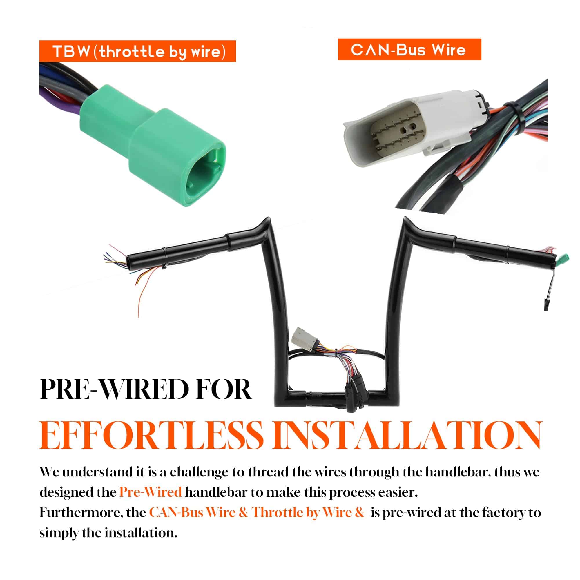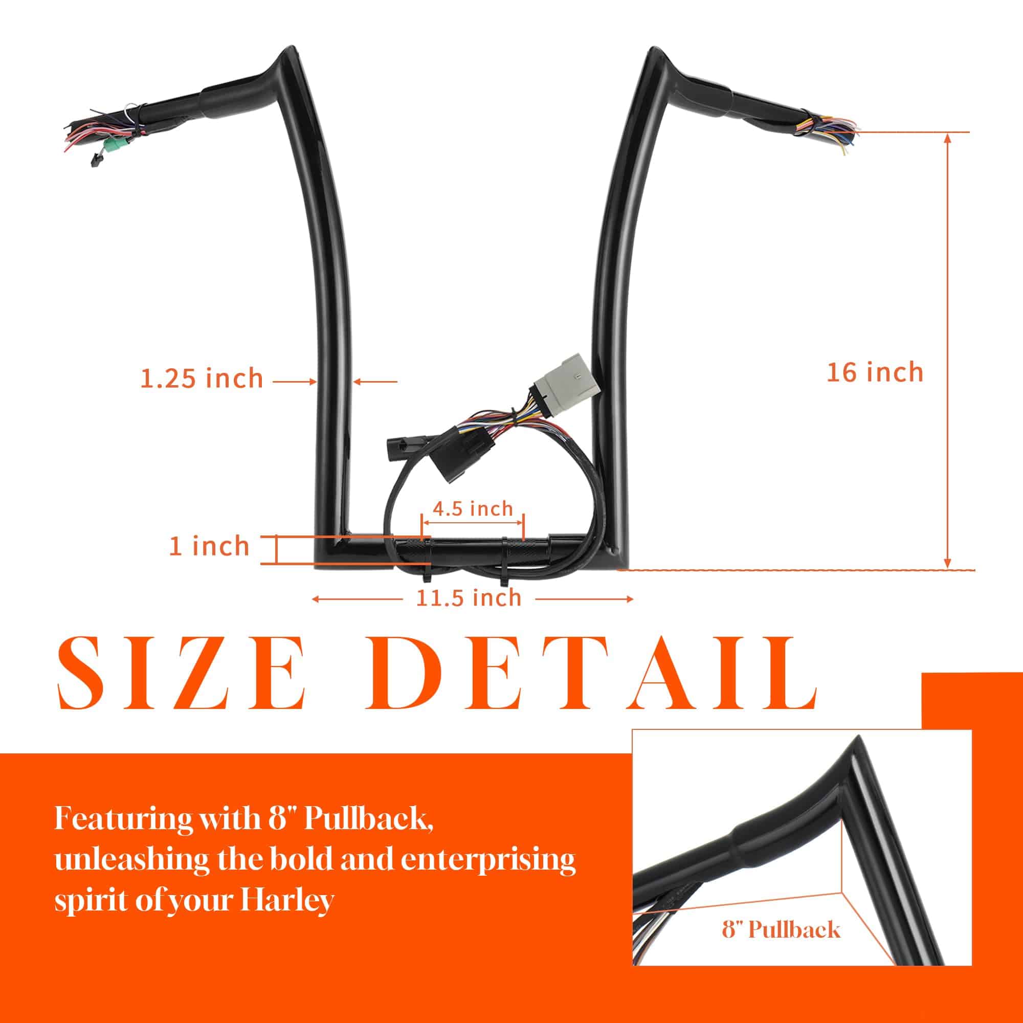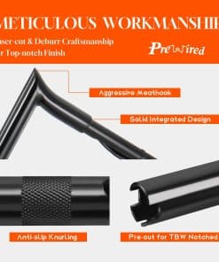Prewired 16″ Rise Pre-wired Ape Hangers Handlebars para Harley 2008-2013 Road Glide FLTR/Road Glide Special FLTRXS/Road Glide Ultra FLTRU con CAN-Bus/TBW/Alambre de Agarre Caliente 1.25″ Meathook Bar, Negro. Nuestros manubrios para manillares son construidos con un diámetro de 1.25″ y una elevación de 16″, presentando una amplia área de sujeción de 5.4″ de ancho con un diámetro de área de sujeción de 1″, brindando estabilidad y control mejorados, complementados por un ancho de base de 11.5″ para un manejo confiado en la carretera. Disfrute de una instalación sin complicaciones con nuestro arnés de cableado CAN-Bus pre-conectado, arnés de alambre TBW (Throttle by Wire) y de agarre caliente (Solo pre-cableado del lado derecho). Atrévase a destacarse con el diseño agresivo y único de nuestras barras Meathook, elevando la apariencia de su motocicleta. Nos enorgullece la meticulosa artesanía de nuestros manubrios. Con un elegante acabado en negro brillante y recubierto en polvo, nuestros manubrios emanan calidad. Sin escoria dentro de los tubos de los manubrios, lo que significa una larga vida útil de los cables, y el diseño en corte láser, biselado y de-burrado asegura un suave tirado interno de los cables, mostrando el acabado de primera categoría de nuestro producto. Incluye 1 manubrio pre-cableado, 1 arnés CAN-Bus plug N play, 1 Lapson Mexico (throttle by wire), 1 arnés de alambre para agarres calientes. Nuestros expertos post-venta siempre están aquí para resolver cualquier problema a tiempo, solo necesitas encontrar el email de PREWIRED en ‘Perfil del vendedor’ y enviarnos un mensaje.
