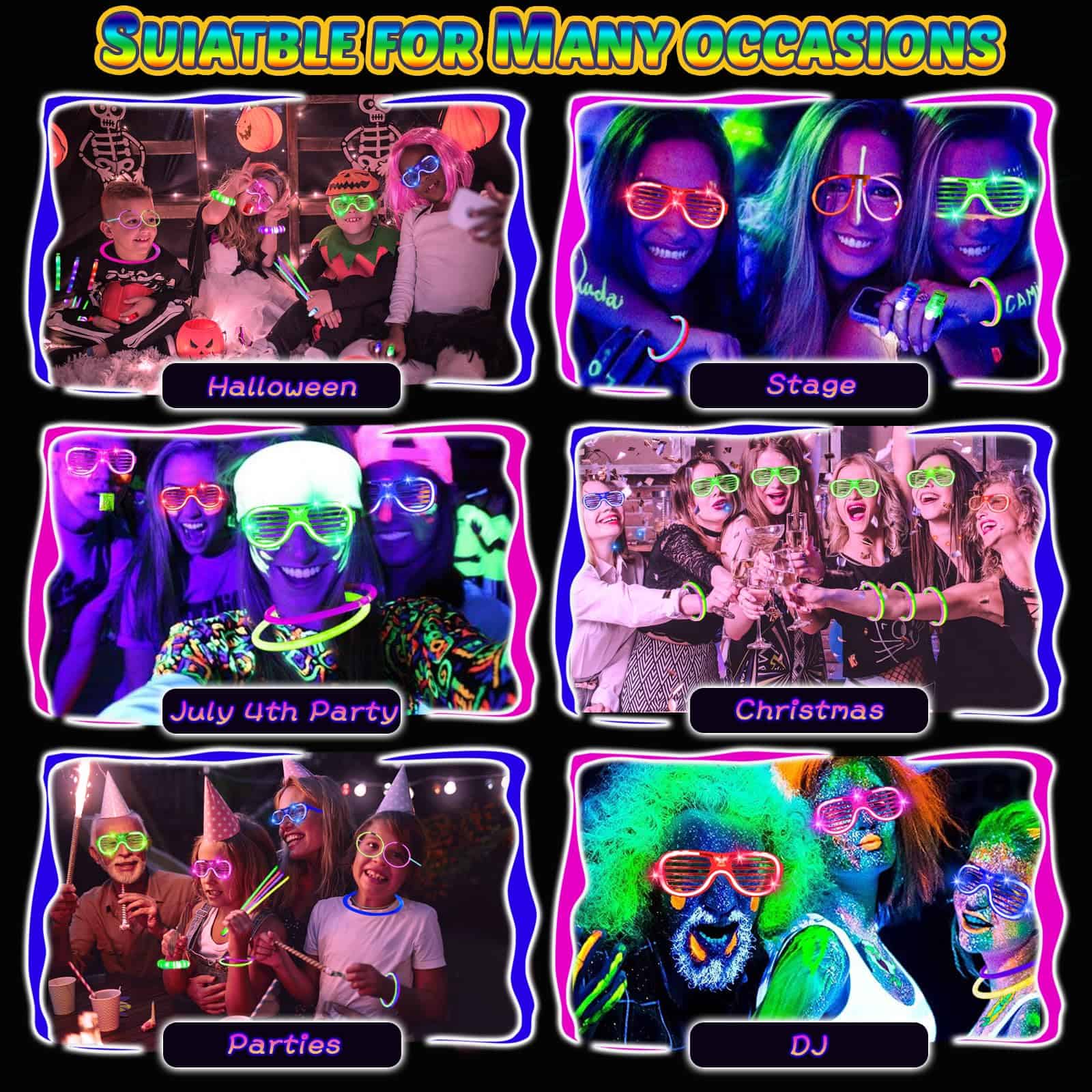 5. Adecuado Para Cualquier Ocasión y Festividades: Ilumina cualquier evento con nuestro versátil set de fiesta glow. Ya sea una boda, acampada, carnaval, rave, concierto, juego deportivo, festival, Halloween o fiesta de cumpleaños. Con colores vibrantes que iluminan la pista de baile, nuestros suministros de fiesta glow son perfectos para crear recuerdos y capturar fotos épicas en cualquier ocasión