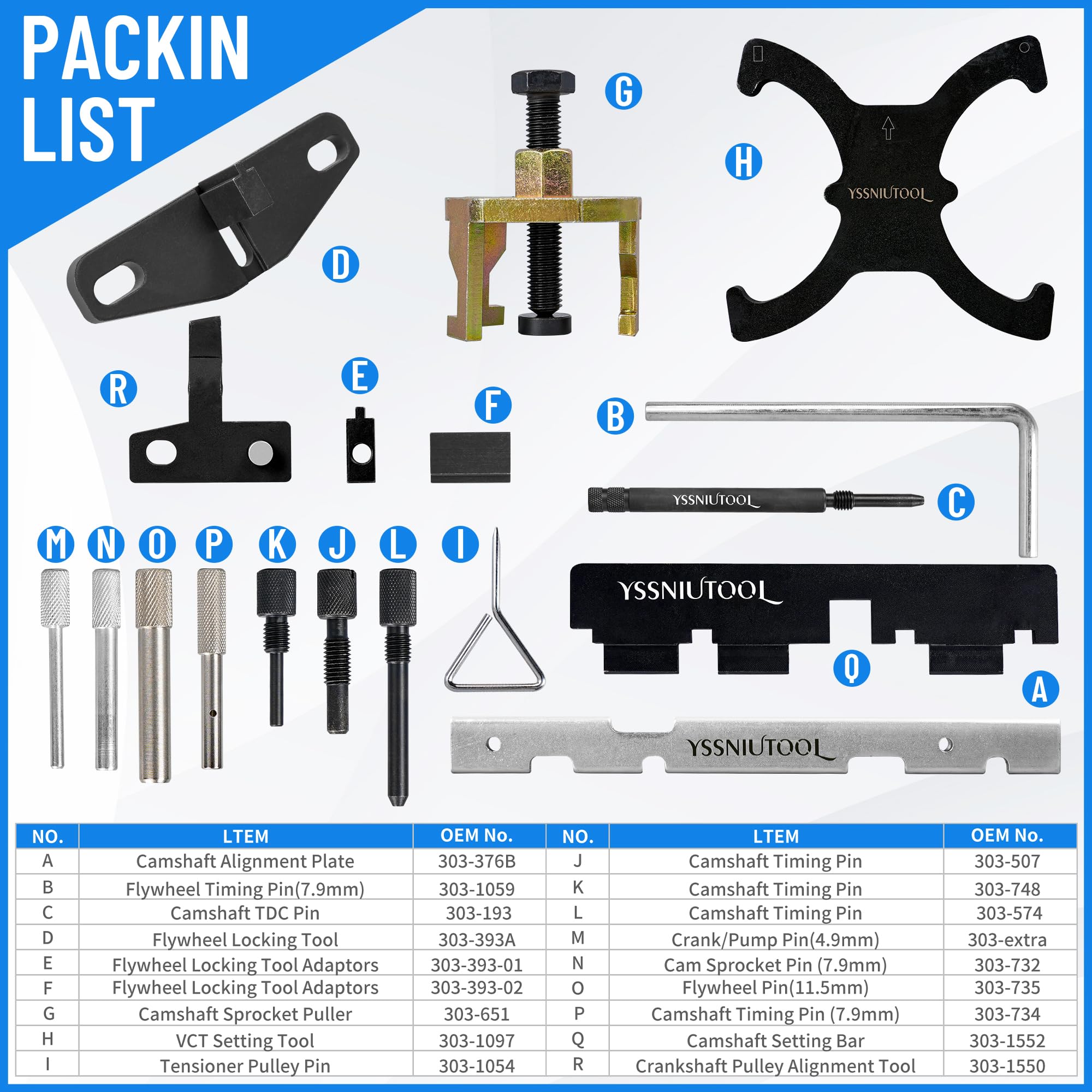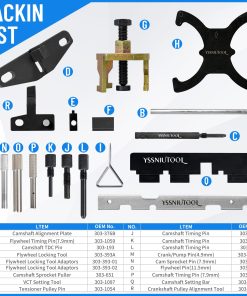 El kit de herramientas de sincronización del motor es una herramienta esencial para ajustar el sistema de sincronización del motor de su vehículo Ford o Mazda para garantizar un rendimiento óptimo y una vida útil prolongada del motor. El kit incluye todas las herramientas necesarias para bloquear y alinear el árbol de levas, el cigüeñal, el tensor de la correa de distribución y ajustar el dispositivo VTC en la posición de sincronización correcta.