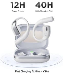 4. Diseñados para la acción: Estos auriculares de oído abierto con clasificación IPX5 resisten el sudor y salpicaduras, haciéndolos perfectos para entrenamientos o aventuras al aire libre. Disfruta de un gran sonido en cualquier condición con estos duraderos auriculares inalámbricos bluetooth de oído abierto.