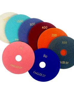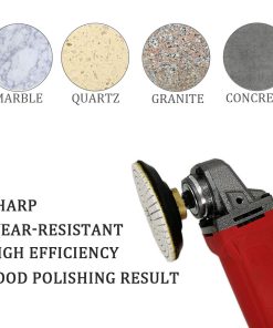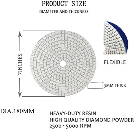 DIÁMETRO 180 mm / 7 pulgadas, ESPESOR 3.0 mm, GRIT 30 50 100 200 400 800 1500 3000 se puede elegir (contáctenos para otro número de grit o cantidad). APLICACIONES: Adecuado para concreto granito mármol piedra de ingeniero. RECOMENDADO 3500 – 5000 rpm (la velocidad de la amoladora o pulidora debe ser inferior a 5000 RPM). USO EN SECO O HÚMEDO. CARACTERÍSTICAS: Afilado, resistente al desgaste y alta eficiencia, buenos resultados de pulido sin dejar ningún color en la piedra.