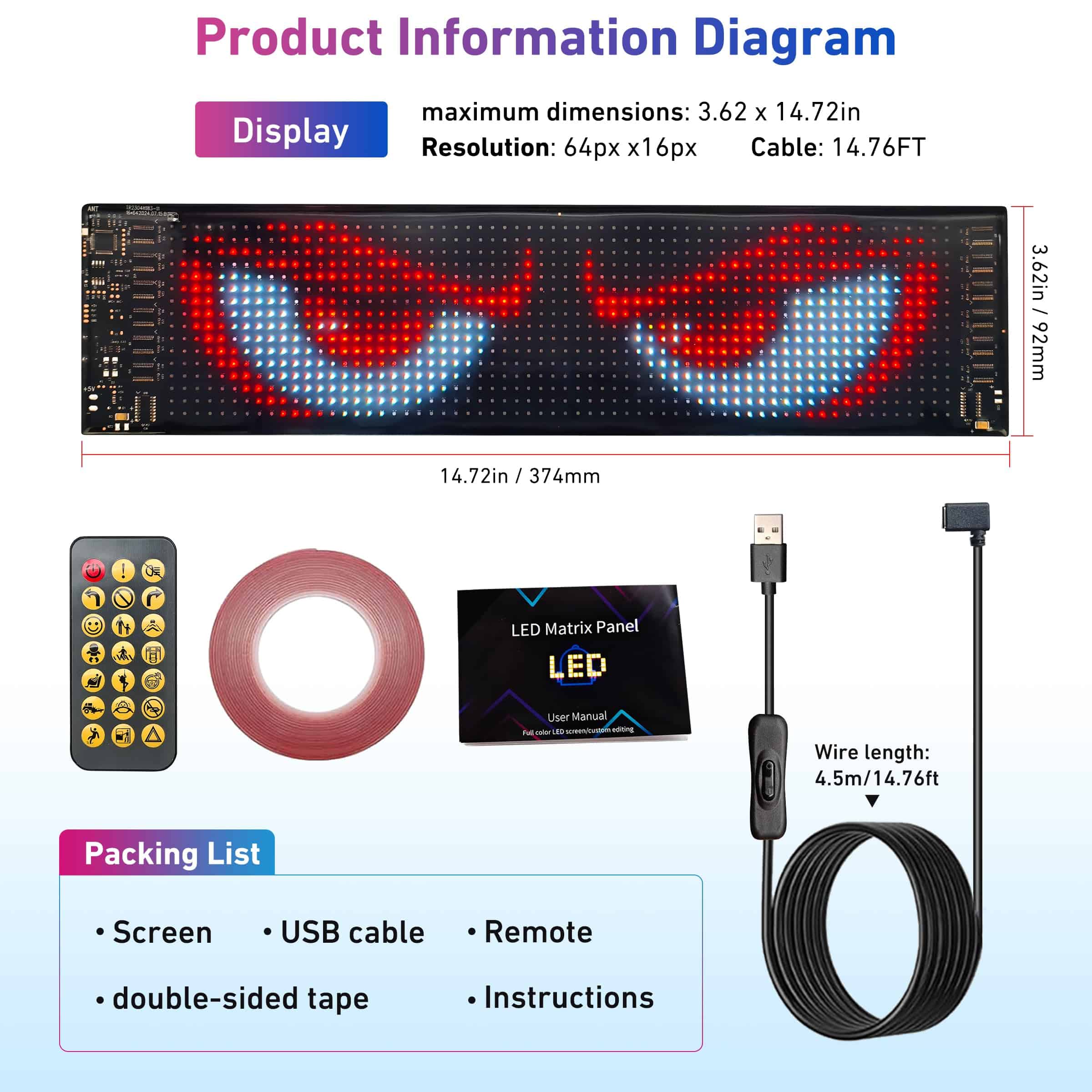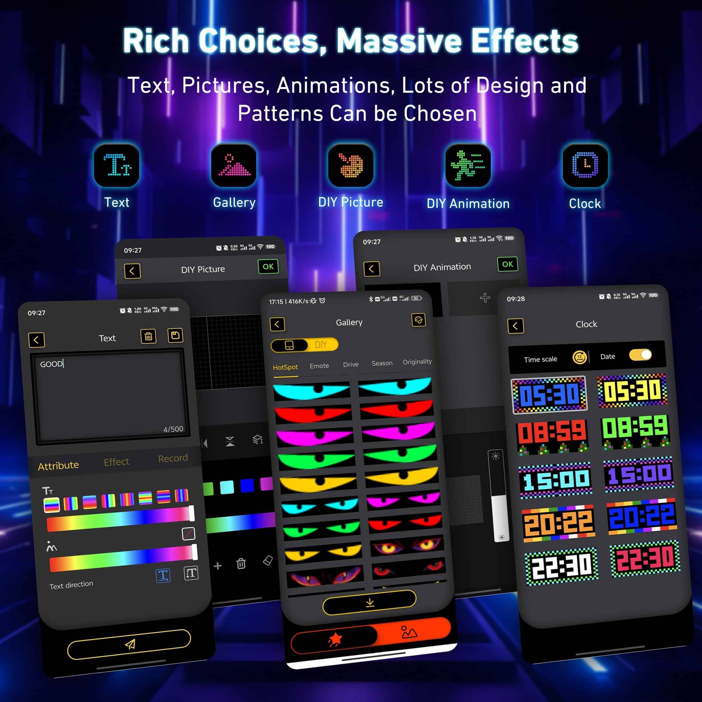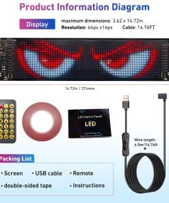 2. Control inteligente de la aplicación y control remoto Nuestra luz de ojos para parabrisas de coche se puede controlar fácilmente a través de bluetooth utilizando la aplicación móvil (iPixel Color) o el control remoto incluido. Personalice el texto desplazable, suba imágenes o utilice animaciones preestablecidas para un toque realmente personal.