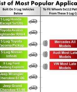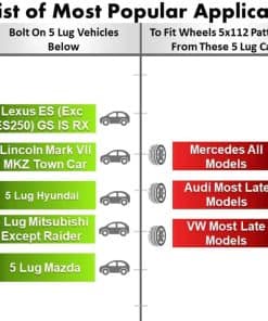 El juego de adaptadores de rueda se utiliza para convertir el patrón de pernos del cubo de 5 lug 4.5 pulgadas (114.3mm) para que se ajuste a las ruedas de 5 lug 112mm. También espaciarán tus ruedas en 1.25 pulgadas para ayudarte a obtener suficiente espacio para neumáticos y llantas más anchos. Mecanizado CNC con artesanía de precisión utilizando billets de calidad aeronáutica 6061 T6. Los pernos de alta calidad están preinstalados y se incluyen las tuercas de montaje de tamaño 12×1.5. Se vende como un par para 2 ruedas. Ordena 2 pares para las 4 ruedas.