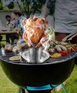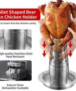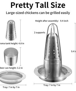 ¿Alguna vez has intentado hacer un pollo asado con cerveza utilizando una lata de cerveza común y te has preocupado por que los materiales de la lata puedan estar cocinando en tu comida El soporte para pollo a la cerveza viene con su propia «lata», hecha de acero inoxidable de alta calidad, este contenedor para dar sabor también te permite experimentar con diferentes líquidos y hierbas para mejorar el sabor del pollo. Hecho de acero inoxidable de alta calidad, resistente y bien construido, este soporte de pollo garantiza una experiencia de asado segura y estable. El soporte mantiene el pollo de forma segura, evitando cualquier balanceo o vuelco durante el proceso de cocción. El material de acero inoxidable es fácil de limpiar, apto para lavavajillas. Puedes usar esponjas de acero para quitar los residuos horneados en cuestión de segundos. El soporte para pollo asado cuenta con su propia lata para que puedas añadir cualquier tipo de cerveza o líquido que prefieras y estar listo para comenzar. Hay múltiples agujeros de vapor que realmente permiten que ese maravilloso sabor se extienda por todo el pollo. La altura del soporte para pollo a la cerveza después del montaje es de 9 pulgadas. Puedes utilizar el asador de pollo con pollos de tamaño más grande porque es bastante alto. Desmontaje y montaje fácil, apto para lavavajillas. Un juego incluye: 1 bandeja de 7 pulgadas por 7 pulgadas, 1 altura de lata de cerveza: 3.2 pulgadas, 1 altura del tanque de aroma: 4.4 pulgadas, 2 alturas de soportes: 21 pulgadas.