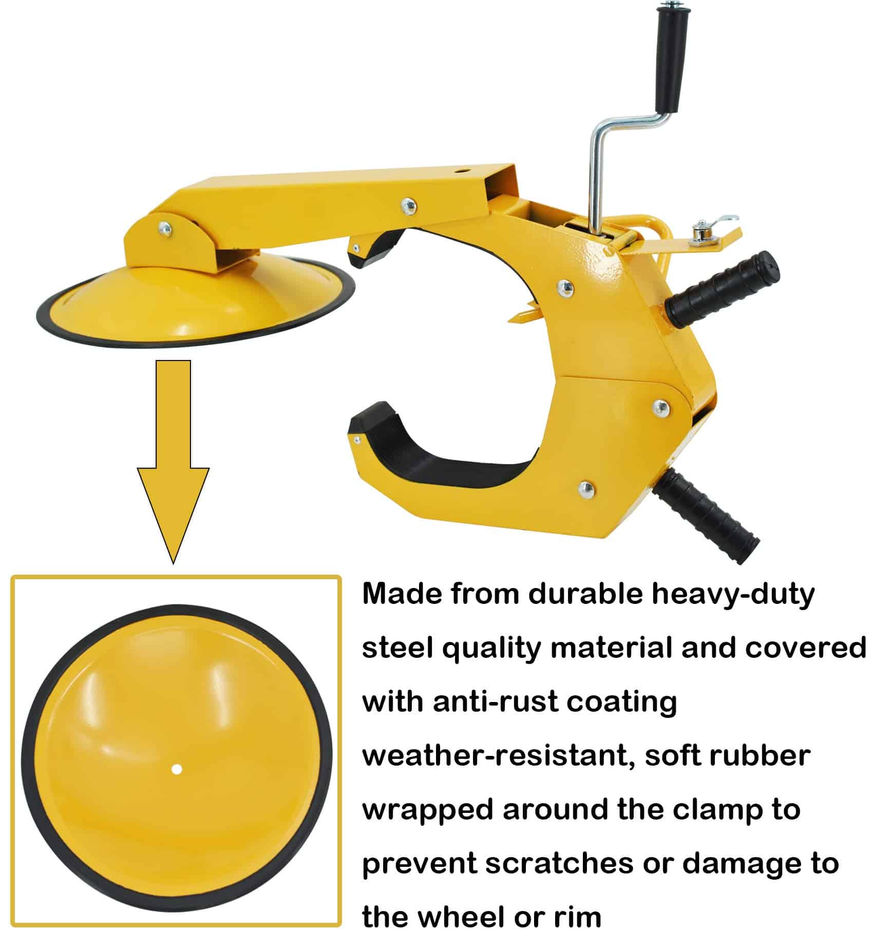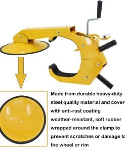 Este bloqueo de rueda para remolque de alta calidad está fabricado con material de acero resistente y duradero, cubierto con un recubrimiento antirrobo que lo hace resistente a la intemperie. La abrazadera está envuelta en caucho suave para proteger la rueda o la llanta de arañazos o daños.