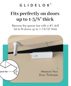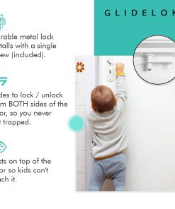 El bloqueo de seguridad para niños GlideLok es un sistema de protección para la parte superior de la puerta, por lo que los niños no pueden alcanzarlo. Esto funciona mejor que hacer que su manija de la puerta sea a prueba de niños o instalar una cubierta de seguridad para el pomo de la puerta, ya que se encuentra completamente fuera del alcance de su hijo. Un perno de metal se monta en el marco de la puerta y el GlideLok se desliza alrededor del perno para cerrar y se liberará desde ambos lados de la puerta. Perfecto para puertas exteriores o más gruesas, pero también se puede utilizar para puertas interiores. El metal pintado es resistente a la intemperie y más duradero que los modelos de plástico. Se puede usar para una variedad de grosores de puertas, la mayoría de las puertas de hasta 1-3/8″ (o hasta 1-13/16″ si retira la barra espaciadora con una broca de 1″ o destornillador). El GlideLok tiene agujeros para la posible unión de un gancho o varilla (no incluidos), lo cual es útil para puertas especialmente altas/adultos más bajos. El GlideLok es un pestillo de seguridad para bebés y niños eficaz y es su primer paso en la implementación de la seguridad en la puerta para los niños.