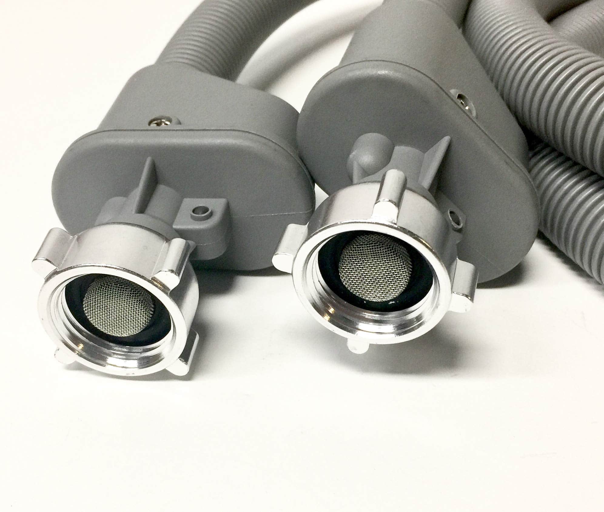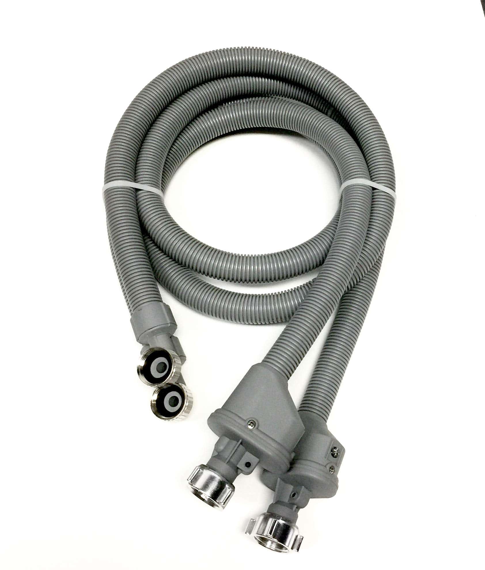 2-pack Mangueras de Lavadora a Prueba de Inundaciones – 5 FT Manguera PVC Resistente Sellada con Pared Externa Corrugada Súper Rígida Para Apagar Automáticamente Cuando Se Detecta Fuga en la Manguera Interior. Características Clave: Dos capas de núcleo de PVC con líneas reforzadas de nylon en el medio y cubierta exterior de PVC rígido con válvula de cierre automático incorporada para prevenir la inundación. Conexiones universales de 3/4″ codo de 90 grados FHT (Hembra con Rosca de Manguera) o FGH (Hembra de Manguera de Jardín). Fácil instalación para líneas de suministro de agua de lavandería en el hogar. Cumple con los siguientes estándares: ASME A112.18.6-2017/ CSA B125.6-17, NSF/ANSI 61,372. Certificado por UPC, WRAS, sin plomo AB1953, RoHS. Mientras que la presión típica de suministro de agua oscila entre 50 – 80 psi, nuestras mangueras están clasificadas para 290 psi con resistencia a ráfagas de hasta 1500 psi. El rango de temperatura de trabajo es de -40 a 210F. Viene con garantía de 10 años para una mayor tranquilidad.