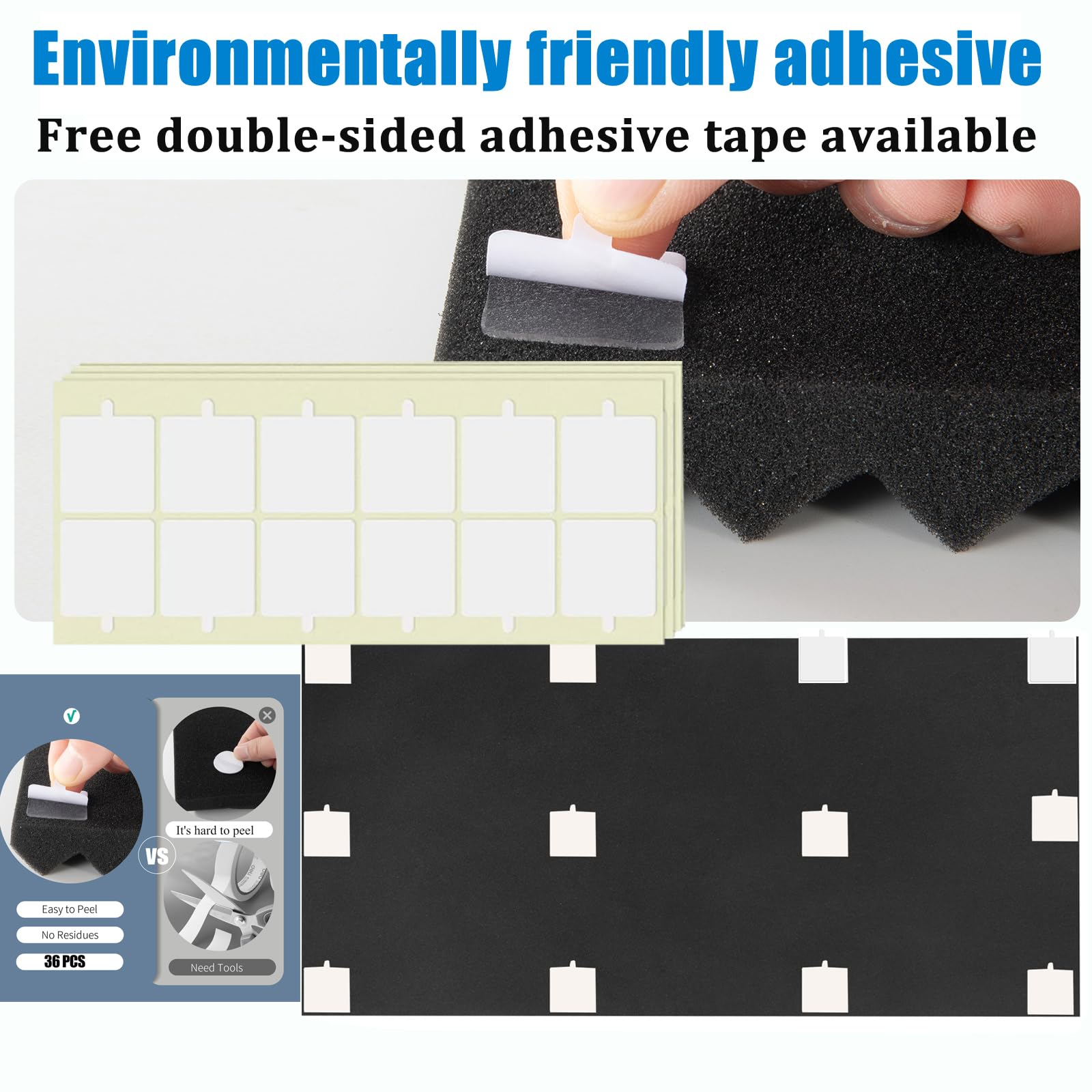 4. Fácil de instalar: nuestros paneles acústicos vienen con cinta adhesiva doble e instrucciones de instalación, 18 pegatinas para cada espuma, no se requieren herramientas especiales para la instalación. Cuando use las pegatinas, asegúrese de que la pared esté plana y libre de cuerpos extraños, lo que afectará el efecto de la adhesión.