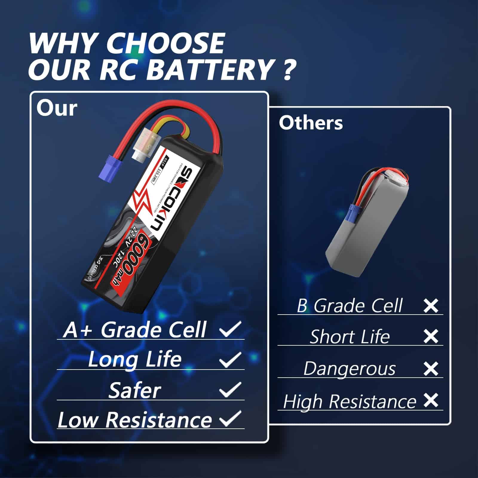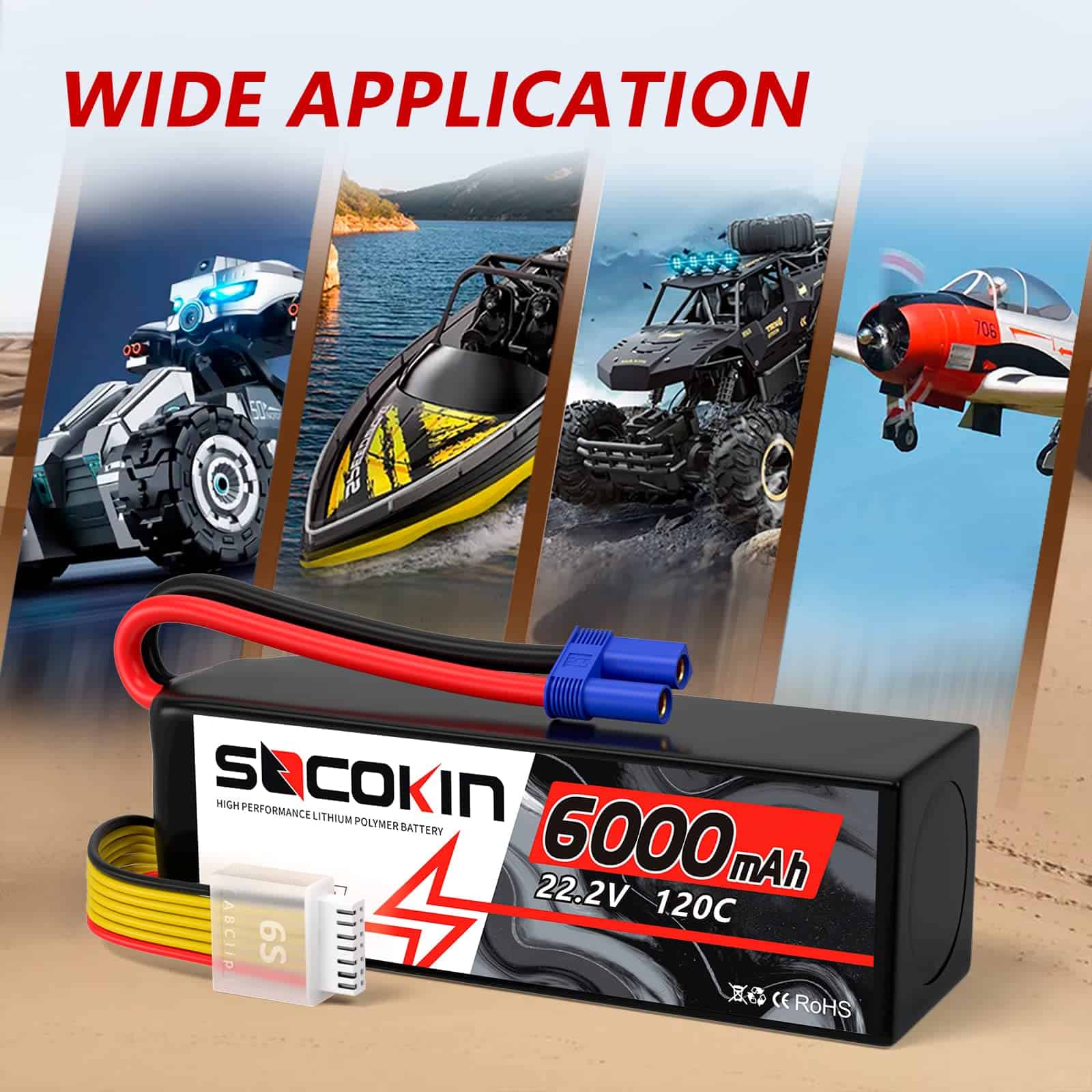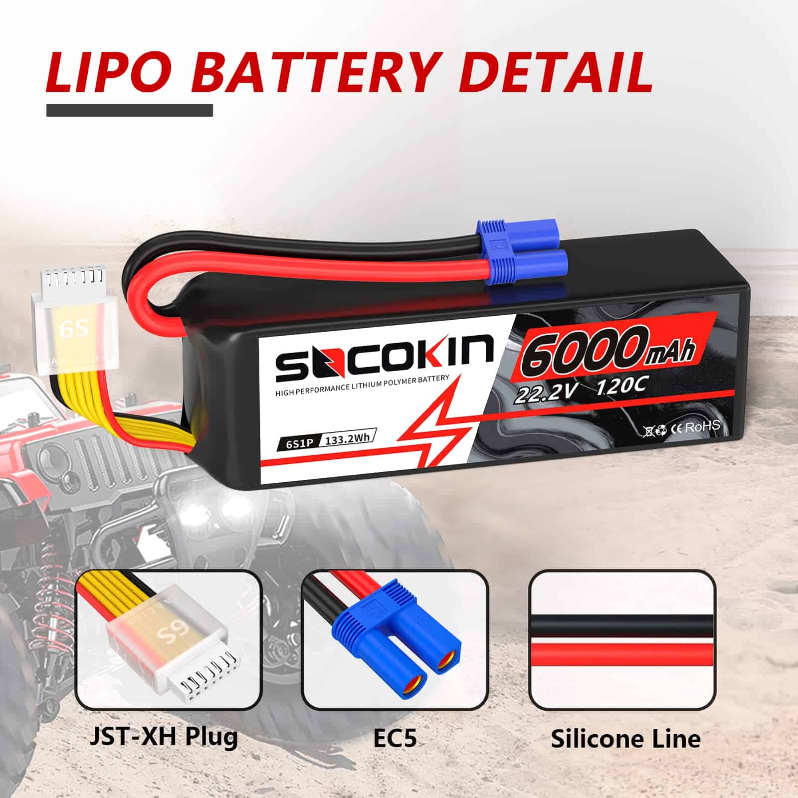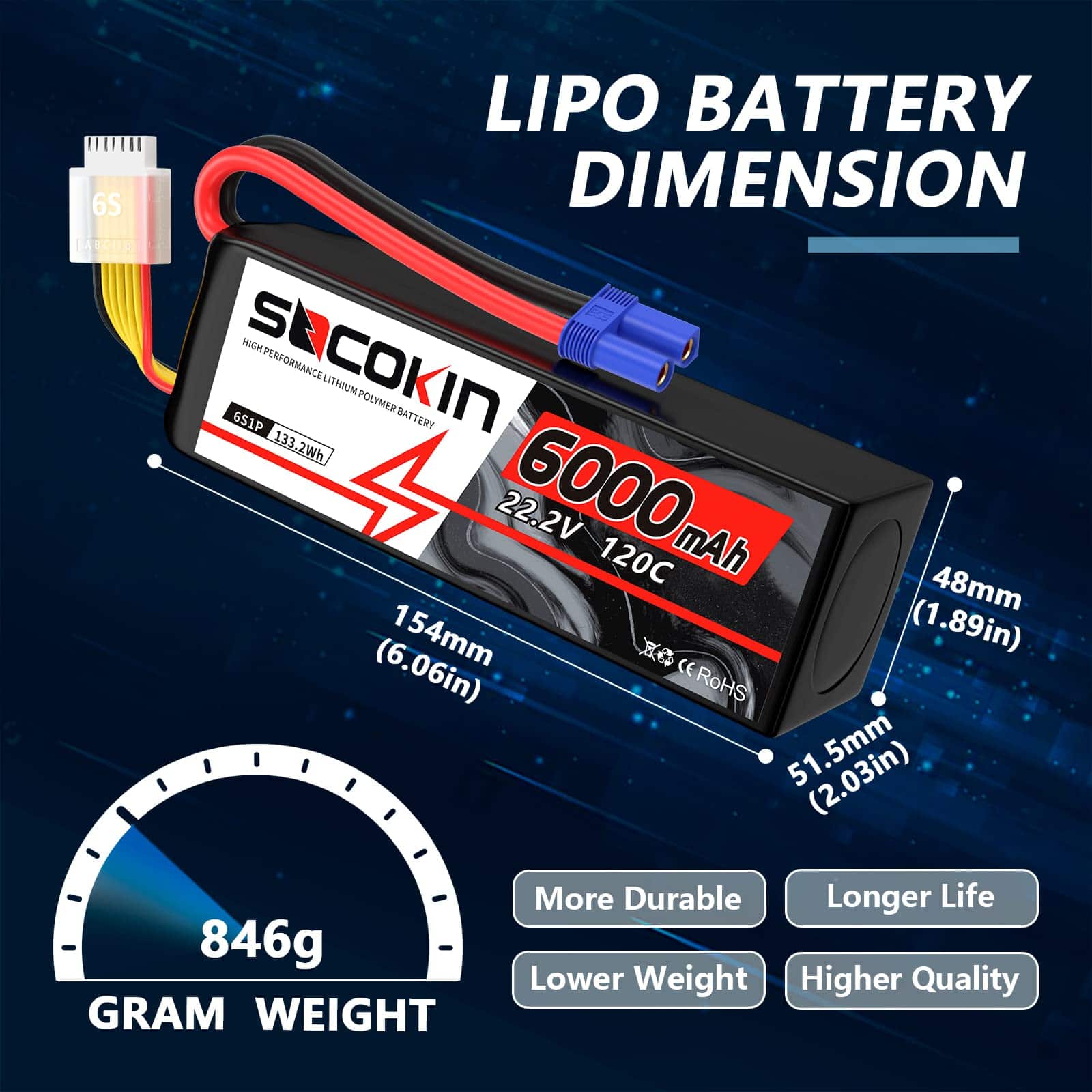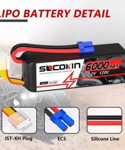 Bienvenido a la tienda de baterías lipo de Socokin! Socokin 22.2V 6S1P 6000mAh 120C RC Lipo Battery consta de 6 celdas con un voltaje de 3.7V en serie. Batería de litio-polímero evolucionada de las baterías de ion de litio. Consejos amigables: en la carga, se recomienda que la corriente sea la mitad a 2 veces la capacidad de la batería. Al usar, asegúrese de configurar la protección de voltaje de la batería lipo. La batería lipo de 22.2V 120C 6000mAh es compatible con aviones RC, vehículos RC, barcos RC, entre otros modelos RC. Socokin Power Direct es una tienda especializada en la venta en línea de baterías lipo para RC.