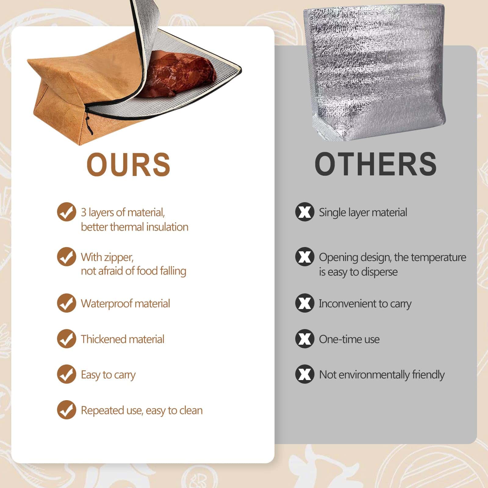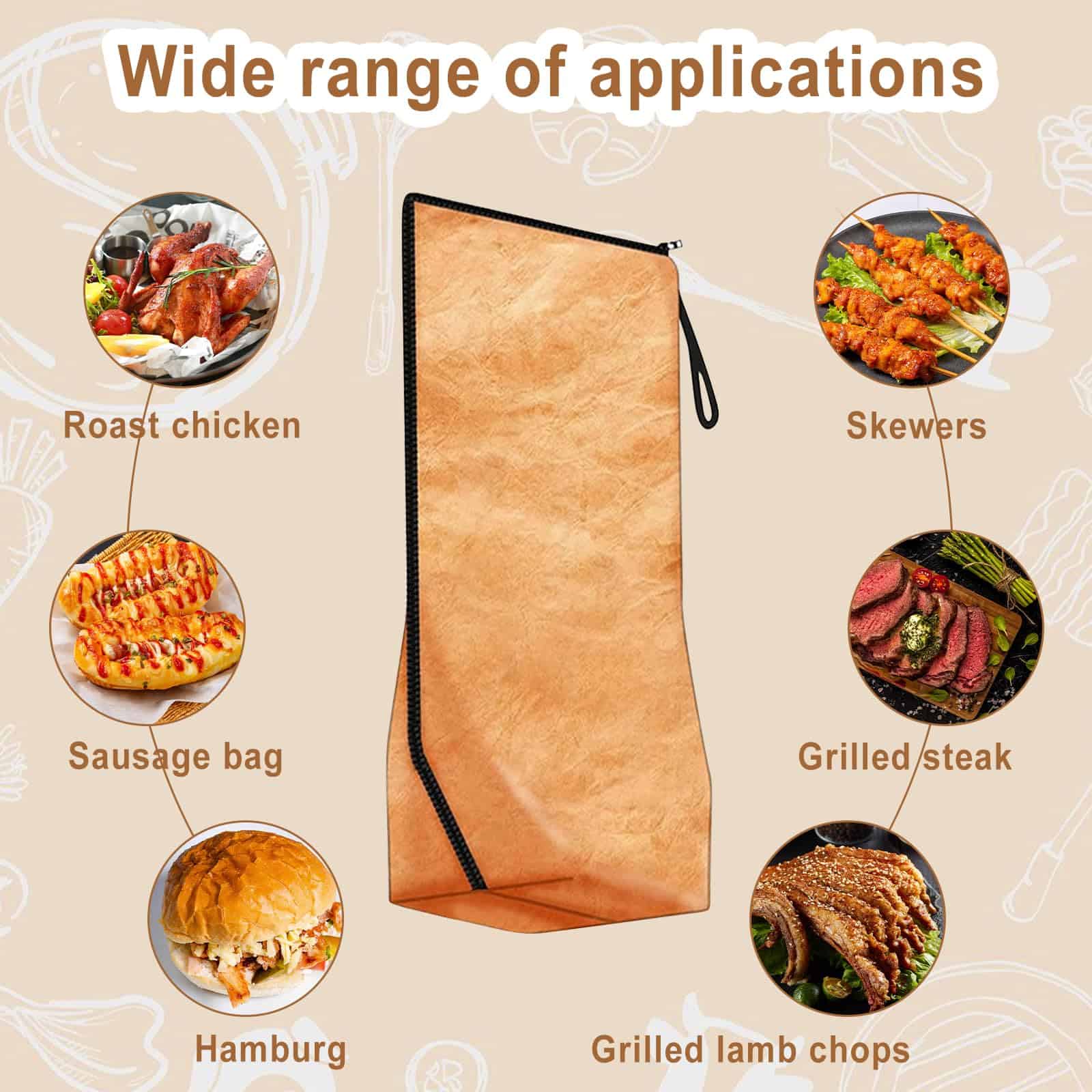 ¿Por qué elegir nuestra bolsa para reposar carne de BBQ? Hecho de papel impermeable DuPont. Diseño de cremallera suave y boca ancha para acomodar paletilla de cerdo, pavo, pechuga de ternera y más. Diseño de correas, puedes colgarlo en un gancho en la cocina u horno cuando no lo necesites utilizarlo temporalmente. Reutilizable y fácil de limpiar. Plegable para almacenamiento, ligero y portátil. Fácil de abrir y cerrar, manteniendo la carne en un espacio cerrado. La bolsa para reposar carne de BBQ está hecha de tres capas distintas de materiales: Papel de tejido liso DuPont, impermeable. Algodón perlado, aislamiento térmico. Papel de aluminio, resistencia a altas temperaturas, reflexión térmica.