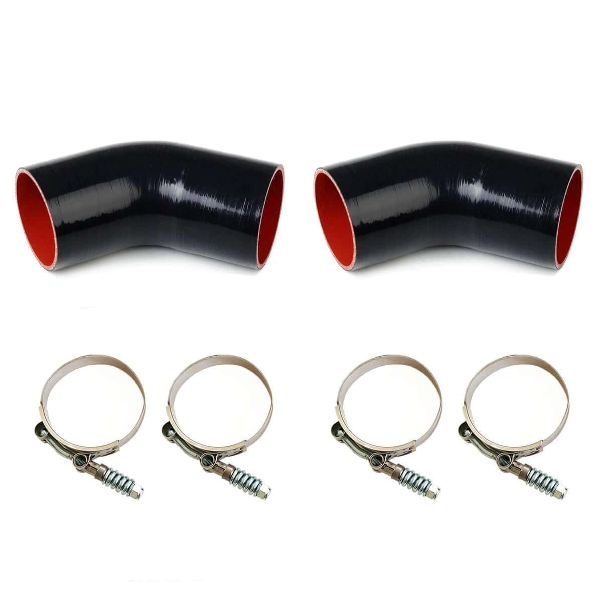 Manguera de Silicona de 45 Grados Negra-Roja DIÁMETRO INTERIOR 3.5″ o 89 mm LONGITUD. 4 pulgadas o 102 mm Grosor de la Pared. 5 mm, 4 capas reforzadas Tolerancia de Tamaño. +/- 0.5 mm Presión de Explosión. 2 Mpa Presión de Trabajo. 0.3 Mpa (43.5 PSI) a 0.9 Mpa (130.5 PSI) Temperatura de Trabajo. -76 F (-60 C) a +500 F (+260 C) Aplicación Universal, como Turbo Personalizado, configuración de tuberías de carga de sobrealimentador, compresor personalizado, admisión para automóviles, vehículos, botes turboalimentados y sobrealimentados, etc. o Abrazaderas tipo T: Material: ACERO INOXIDABLE 301 DE ALTA CALIDAD Paquete 2 PCS manguera de silicona Reductor 4 PCS abrazadera tipo T