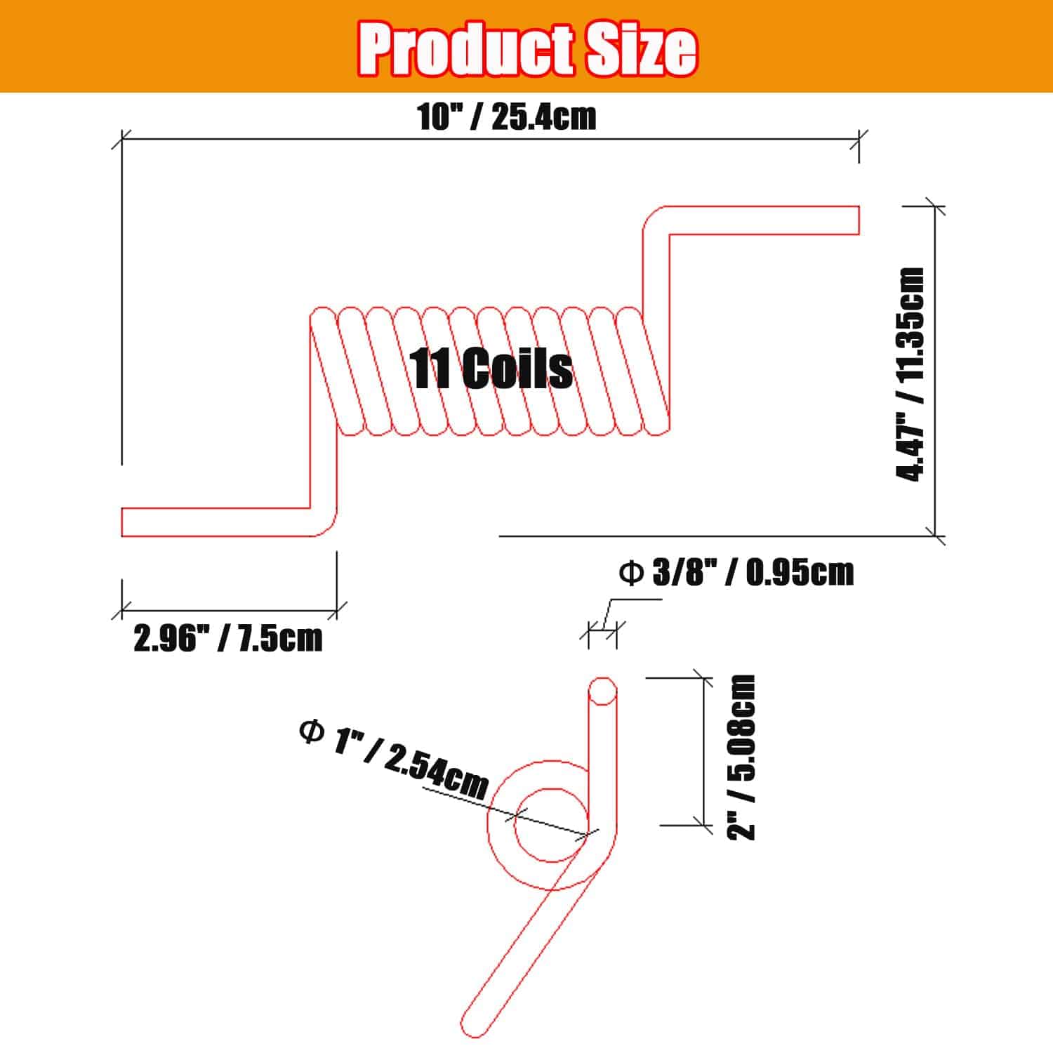 Resorte de Puerta de Rampas de Mediano Peso para Repuesto de Hauler de Juguetes Característica: 11 Vueltas Diámetro del Alambre: 3/8″ (0.375) Diámetro del Barril: 1 pulgada Longitud de la Bobina: 5 pulgadas Longitud del Resorte en General: 10 pulgadas Acero de alta resistencia Semibrillante, recubierto en polvo negro