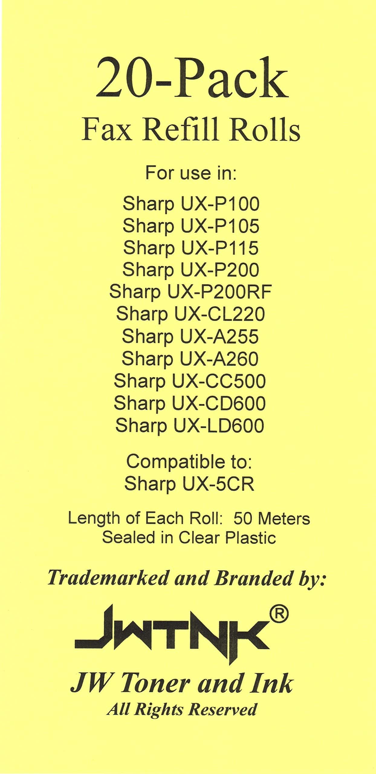 20-Pack de Rollos de Recambio de Cinta de Película para Fax, compatible con las siguientes máquinas de fax de Sharp: UX-P100 UX-P105 UX-P115 UX-P200 UX-P200RF UX-CL220 UX-255 UX-A255 UX-260 UX-A260 UX-CC500 UX-CD600 UX-LD600. Compatible con los rollos de recambio de fax original Sharp UX-5CR. Los nombres de modelo y marca, utilizados aquí como referencia solamente, pertenecen a sus respectivos propietarios.