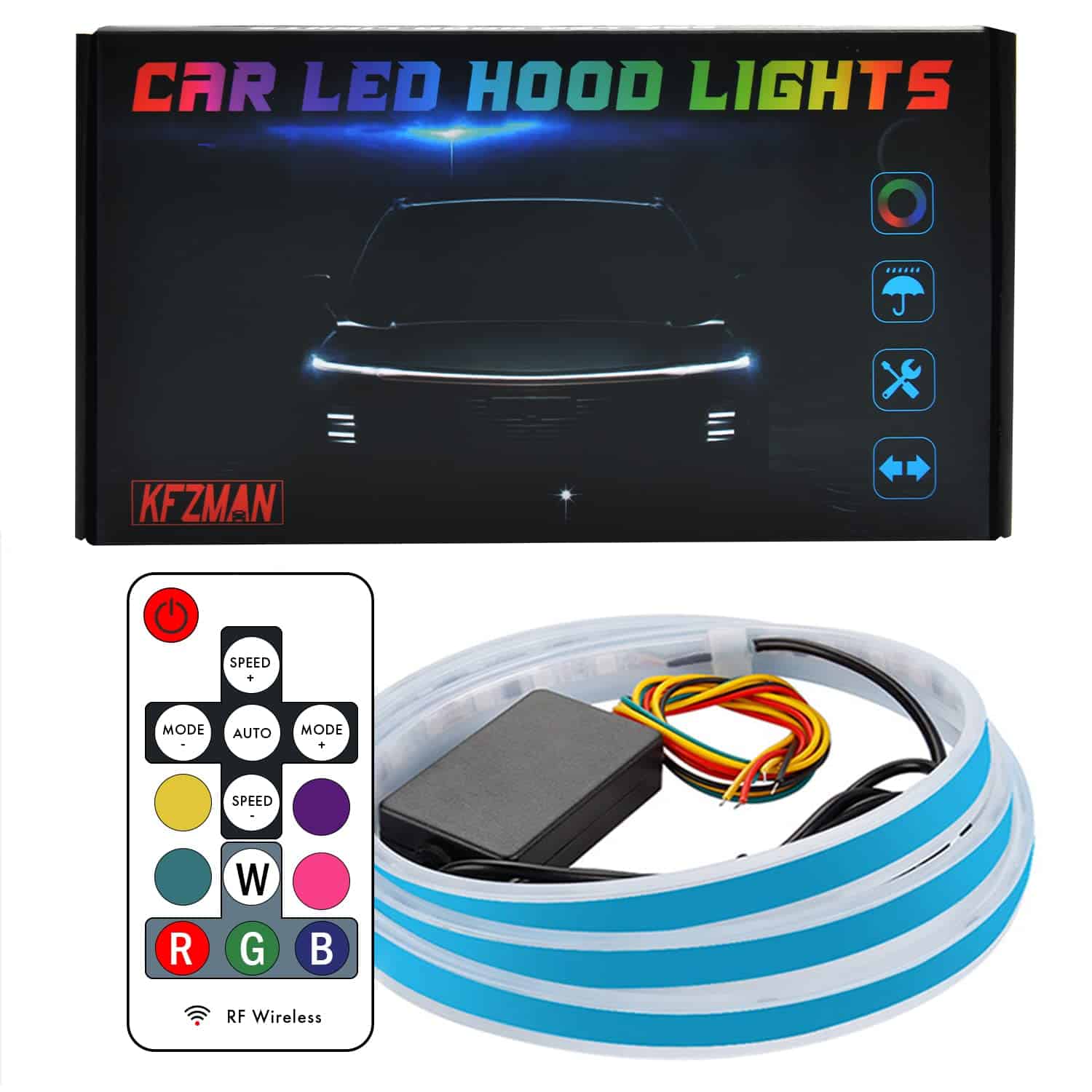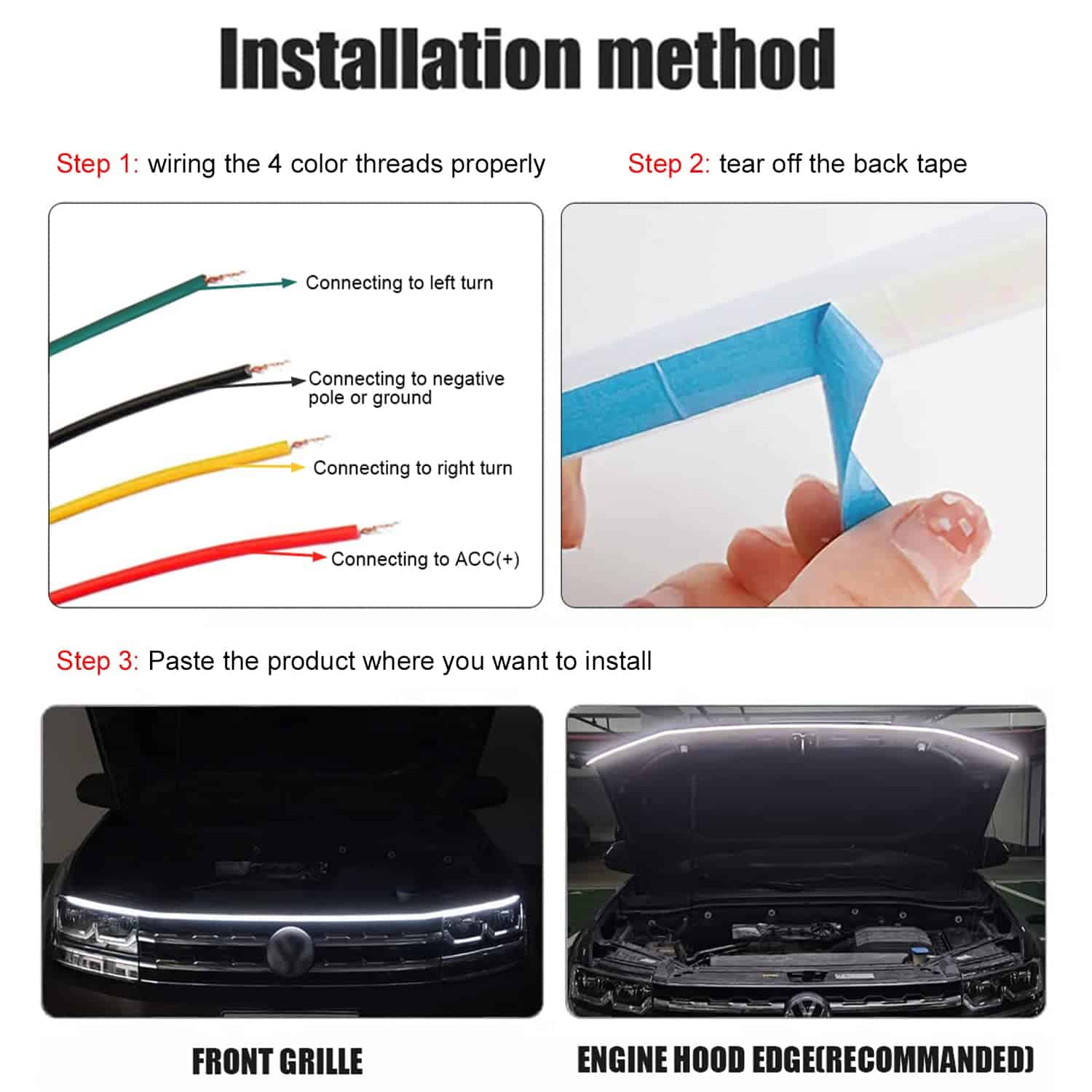 Las luces de capó de coche dinámicas de 70 pulgadas del 2023 con luz de giro y doble destello te brindarán un nuevo nivel de personalización y estilo a tu vehículo. Con una amplia variedad de modos de iluminación y un control remoto para cambiar entre ellos, podrás seleccionar la configuración perfecta que se adapte a tu gusto personal. La calidad premium de estas luces garantiza un rendimiento duradero y resistente a las condiciones adversas, como la lluvia y la nieve. La instalación es sencilla y segura, gracias al adhesivo fuerte que mantendrá las luces en su lugar. Asegúrate de seguir las instrucciones de cableado para un funcionamiento óptimo. Con estas luces de capó, tu coche, SUV, camión o vehículo todo terreno lucirán increíbles y destacarán en la oscuridad, agregando un toque de estilo único a tu conducción nocturna.