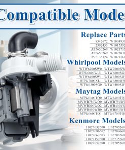 TOMOON W10536347 Bomba de desagüe para lavadora compatible con lavadoras Whirlpool Kenmore, 120V 60Hz 0.95A. Paquete incluye 1 Bomba de desagüe W10536347 para lavadora 3 tornillos de montaje. Alta calidad ahorra tiempo y dinero. Una experiencia de compra cómoda. NÚMERO DE REEMPLAZO W10217134 AP5650269 W10281682 PS5136124 COMPATIBLE CON Kenmore – 11027032600 11027032601 11027032602 11027062602 11027072603 11027082604 11027086605 11027092600 11028042700. Whirlpool – WTW6300SG1 WTW6300SB0 WTW6200VW1 WTW6340WW0 WTW6400SW3 WTW6600SG0 WTW6700TU1 WTW6800WL1, etc.