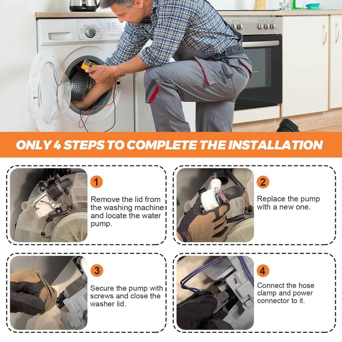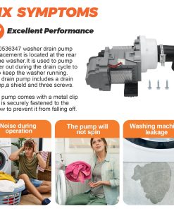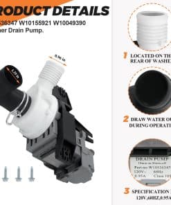 DESCRIPCIÓN DEL PRODUCTO: Una bomba de desagüe para lavadora bombea agua sucia fuera de su lavadora cuando termina el ciclo de centrifugado. Con el tiempo, es posible que el motor de la bomba de desagüe falle o que el cuerpo se agriete. Cuando esto sucede, se queda con una lavadora que no drena, que gotea agua en el piso o que no funciona en absoluto. PAQUETE INCLUYE: 1 Pc Bomba de Desagüe W10536347 3 Pcs Tornillos de Montaje FÁCIL DE INSTALAR Herramientas Necesarias: Alicates, destornilladores Consejos de Instalación: Encuentre la bomba de descarga en la lavadora con más de 5 agujeros en el cuerpo. Desenchufe la lavadora, deshaga las mangueras de suministro/descarga de agua, retire la parte trasera, coloque la lavadora boca abajo. Deshaga 2 abrazaderas de manguera, 1 conector eléctrico y 3 tornillos para quitar la bomba. SOLUCIONA LOS SIGUIENTES SÍNTOMAS: La lavadora no drena, Error LD Ruidoso, pero no girará La lavadora gotea La ropa está más húmeda de lo habitual FUNCIONA CON LOS SIGUIENTES NÚMEROS DE MODELO: Kenmore: 11028081700 11028062800 11027032602 11027042603 11027072600 11027082604 11027087603 11028032701 11027062600 11028087700 11027062601 11027062602 11027062603 11027062604 Whirlpool: WTW6200SW0 WTW6200SW1 WTW6200SW2 WTW6200SW3 WTW6200VW1 WTW6300SW0 WTW6300SW1 WTW6300SW2 WTW6300WW0 WTW6340WW0 WTW6400SW0 TENGA EN CUENTA: Tenga en cuenta que las piezas de electrodomésticos pueden parecer similares de muchas maneras. Si no está seguro de si una pieza que está ordenando se ajusta a su modelo, envíenos un correo electrónico antes de ordenar. Incluya su número de modelo y número de serie. Podemos verificar que la pieza se ajustará a su modelo.