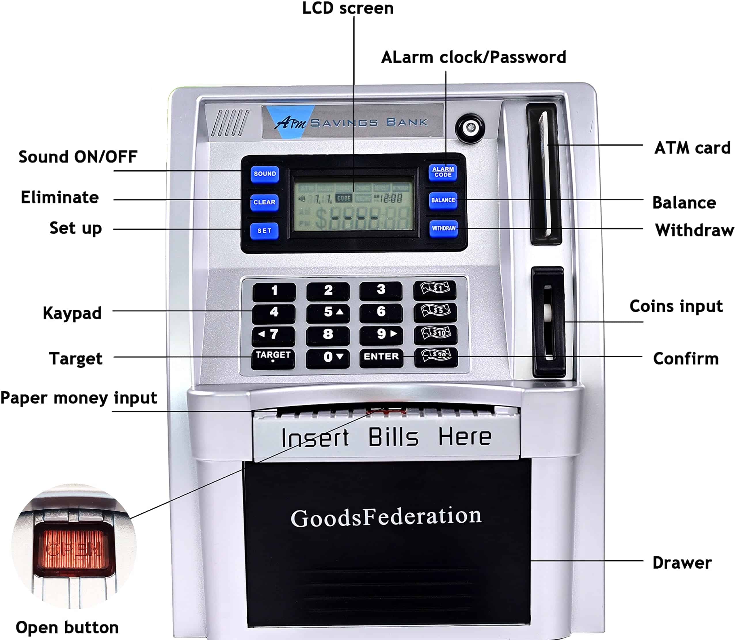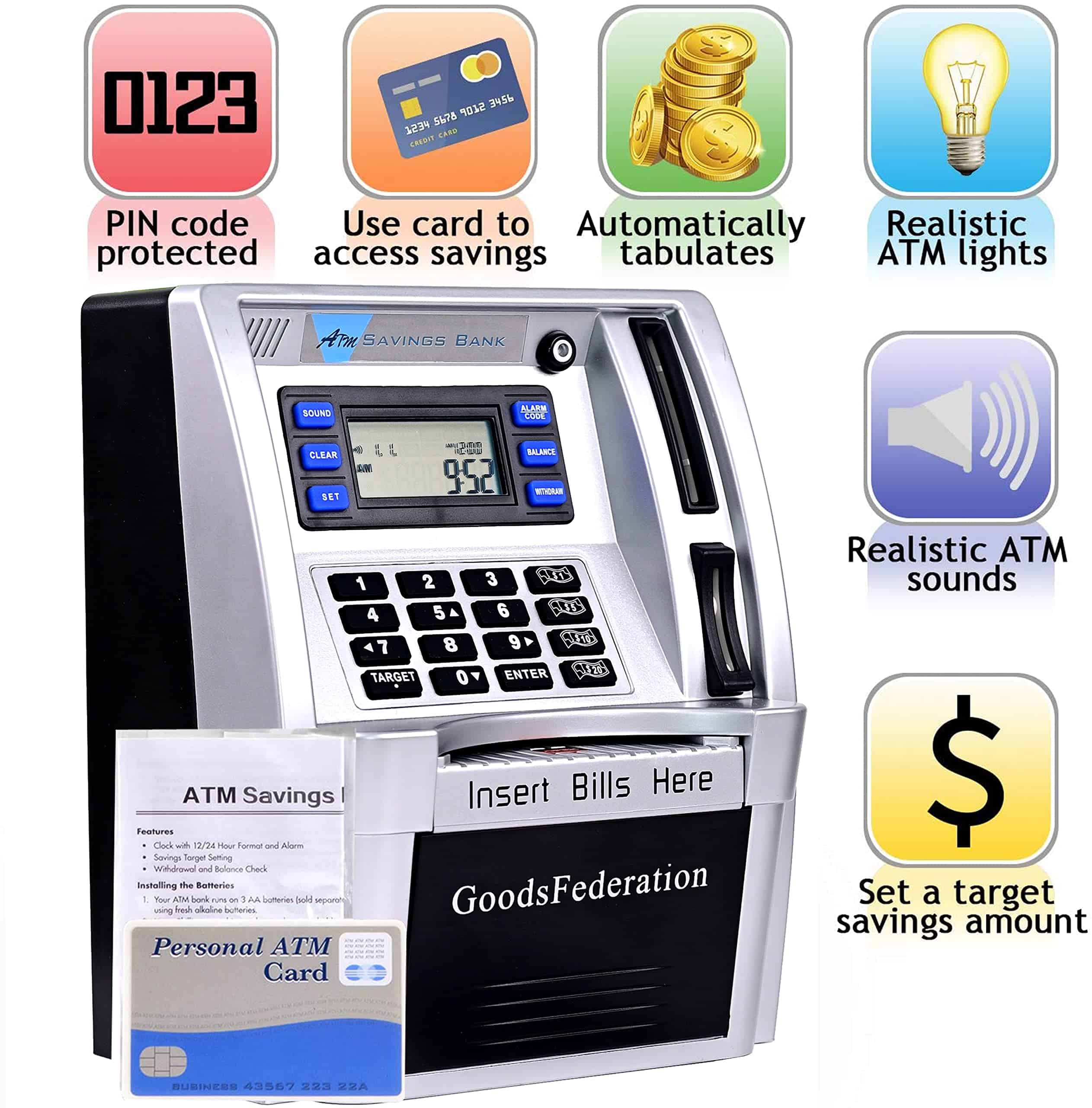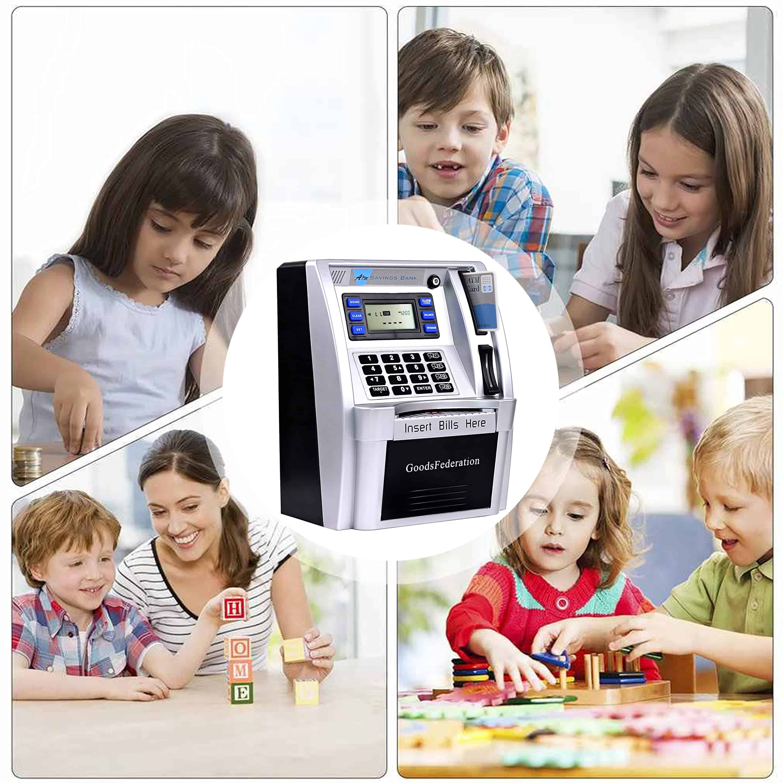 Ama a tus hijos enseñándoles a ahorrar en bancos y administrar sus finanzas. Maneja su dinero de bolsillo con esta máquina de cajero automático mejorada y realista. Características del producto: Gestionar tus finanzas con este cajero automático personal realista que solo se activa con la tarjeta provista y el código personal de 4 dígitos. La máquina acepta y reconoce cada moneda insertada y también acepta billetes al pasarlos por la ranura en la parte delantera de la máquina. ¡Enseña a los niños cómo ahorrar dinero y hacer seguimiento del progreso de sus ahorros! Cuenta con una alarma con reloj y calendario en tiempo real. ¡La máquina se ilumina y emite sonidos reales de cajero automático cuando se usa! Haz que ahorrar dinero sea divertido para los niños con la Hucha Digital de cajero automático Money Machine. Enseña a los niños la importancia del ahorro con esta caja de dinero simulada. Esta Hucha Personal de mi cajero automático con pantalla digital es el accesorio perfecto para que tus hijos comiencen a aprender sobre el ahorro. Los niños incluso pueden establecer objetivos de ahorro y consultar la pantalla para ver cuántos días o cuánto dinero les falta para alcanzar sus metas. ¡La alarma integrada sonará si alguna mano pegajosa intenta robar los ahorros de tu personal Caja de dinero! La ranura de monedas reconoce la denominación de cada moneda para ayudar a llevar un registro de los saldos de la cuenta. También se pueden depositar billetes y se puede utilizar el teclado para actualizar la cantidad en la cuenta. Este Banco también cuenta con funciones integradas como hora, reloj de 24 horas, fecha, alarma, calculadora y sonidos y tonos de cajero automático para una experiencia realista. Incluye: 1 Hucha de ahorros de cajero automático, tarjeta bancaria para operar el cajero automático y manual de instrucciones. Se requieren 3 pilas AA (no incluidas).