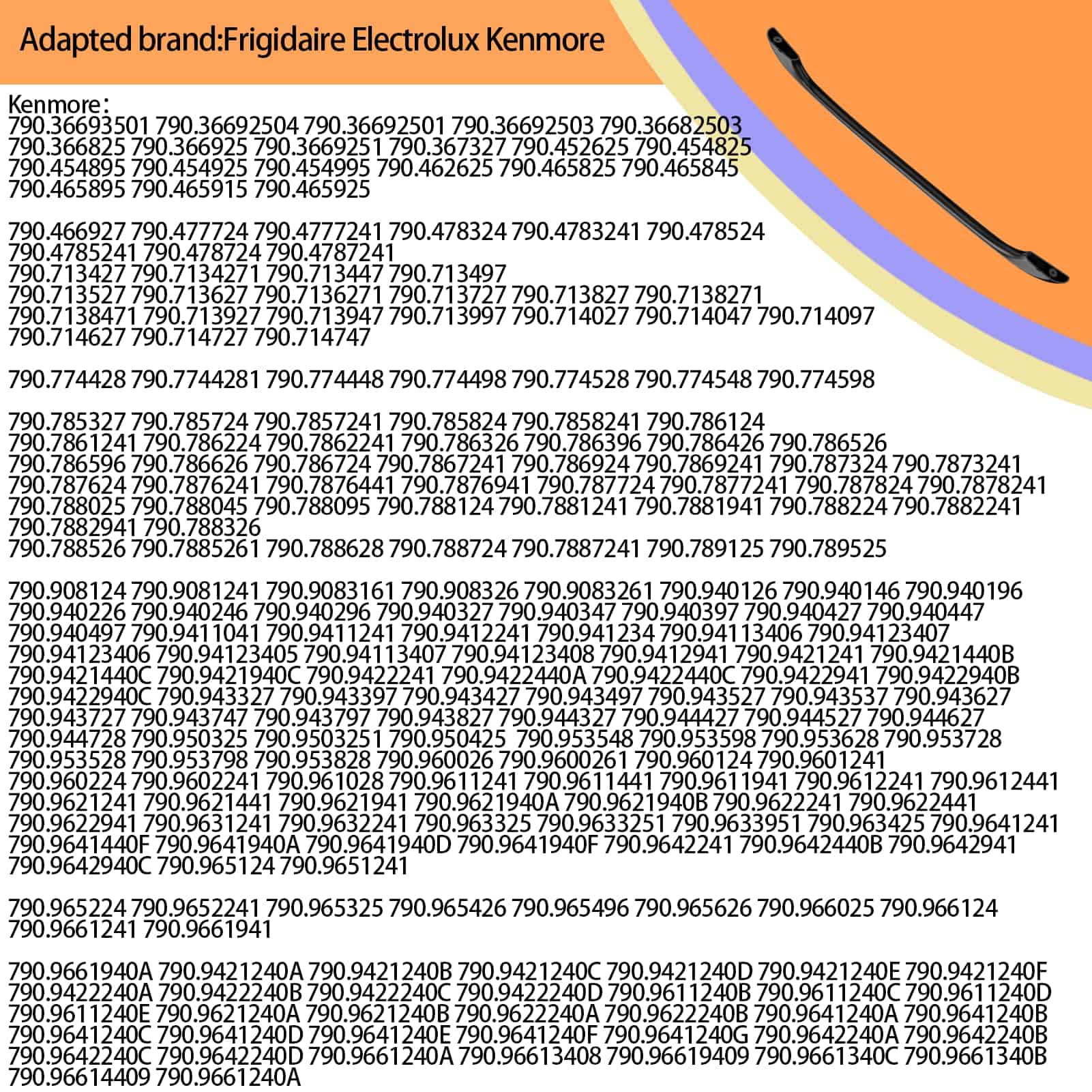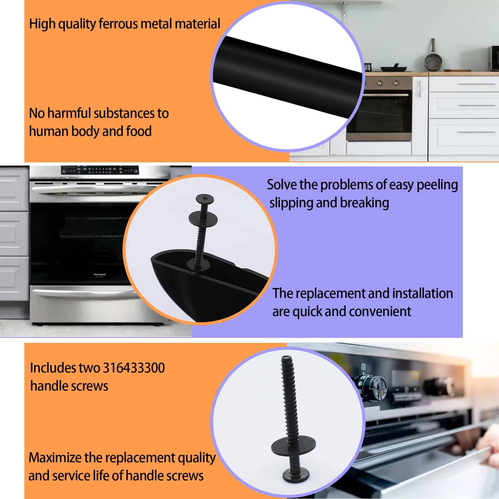 Nuestra manija de puerta de horno 5304458312 reemplaza el número de pieza 316443600 AP3965016 1198679 PS1533002 AH1533002 EA1533002. Compatible con Kenmore, Frigidaire, Electrolux. Reemplaza los números de modelo de horno que comienzan con 790.3 790.4 790.5 790.6 790.7 790.9, etc. Fácil de instalar, se puede buscar un tutorial detallado en el sitio web de YouTube. Fabricado en nuestra propia fábrica profesional de manijas de puerta de horno, con materiales de alta calidad y durabilidad mejorada. Ofrecemos una garantía de dos años con un servicio postventa confiable.