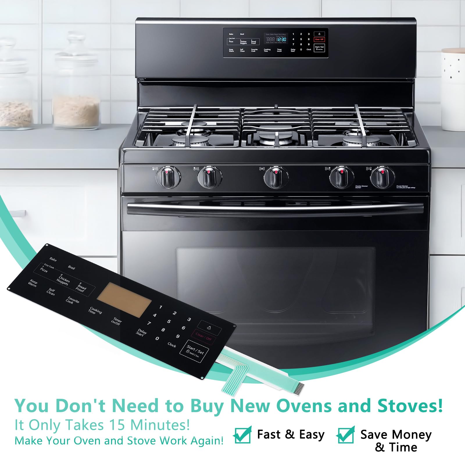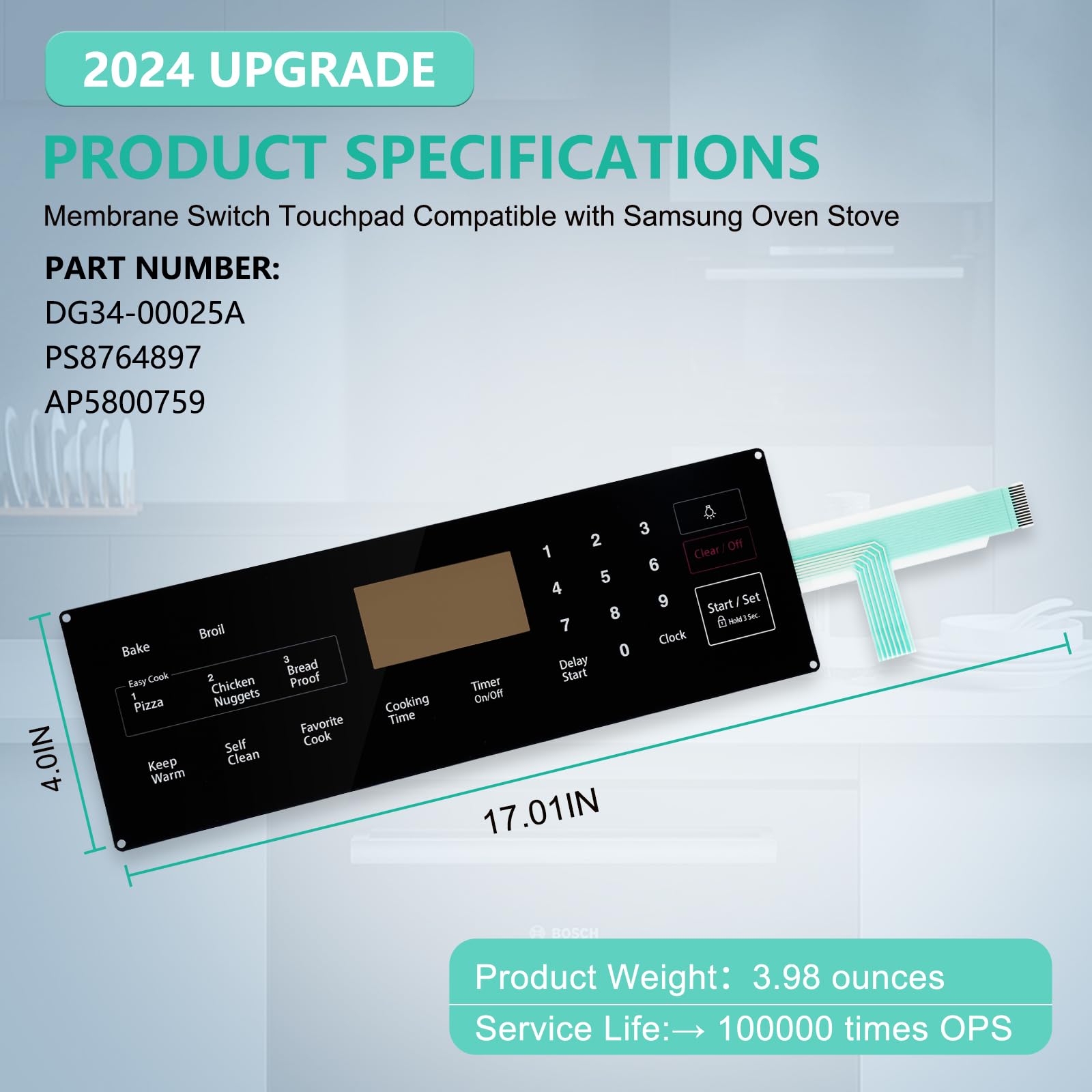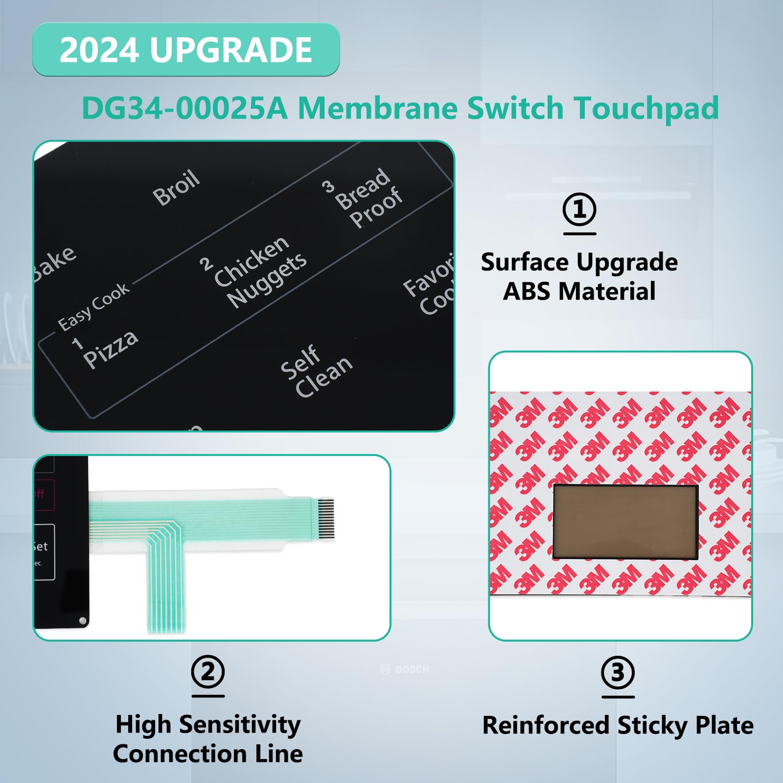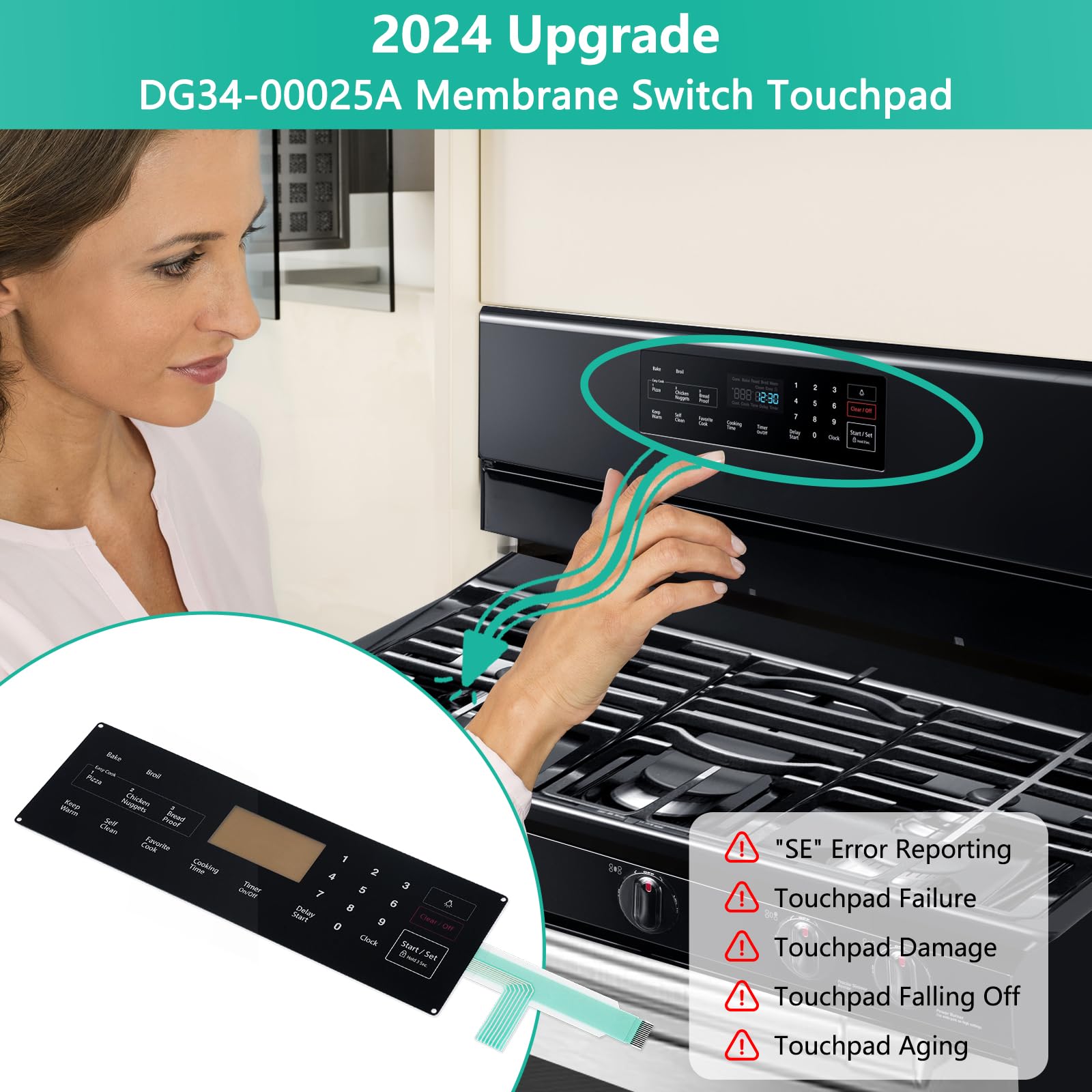 La superficie del interruptor de membrana 2024 mejorado DG34-00025A Touchpad está hecha de material ABS de alta calidad, resistente a altas temperaturas, aceite y corrosión, lo cual es perfecto para el entorno de trabajo de alta temperatura del horno estufa Samsung, y cuenta con mejor brillo y sensación táctil.¡Se puede utilizar durante más tiempo que la versión anterior! El número de parte de sustitución del horno estufa Samsung DG34-00025A PS8764897 AP5800759. Los números o modelos de dispositivos disponibles se pueden encontrar en la página de detalles a continuación, incluyendo NX58F5300SS NX58F5500SB NX58F5500SS, etc. ¡Cada interruptor de membrana DG34-00025A Touchpad ha pasado inspección de calidad al 100%, le proporcionamos 2 años de garantía de calidad, y a través del envío rápido a sus manos, si el producto en sí tiene un problema, por favor contáctenos, ¡reemplazaremos incondicionalmente el producto para usted!