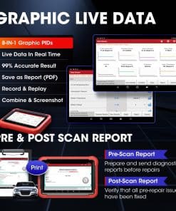 5. Escaneo de Todos los Sistemas + Datos en Vivo Gráficos + Informe Pre y Post: En solo 30 segundos, la herramienta de diagnóstico obd2 puede escanear profundamente 7000+ DTCs de todos los sistemas y borrarlos con un toque. El flujo de Datos en Vivo Gráfico permite rastrear el estado de funcionamiento en tiempo real de manera comprensible. Súbelo a la Nube y revísalo en cualquier momento. Si necesitas una copia impresa, solo conéctate a una impresora Wi-Fi e imprímelo. Los informes de escaneo pre y post facilitan el registro de la condición de un vehículo antes / después de las reparaciones.