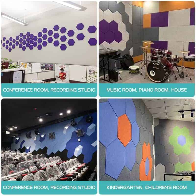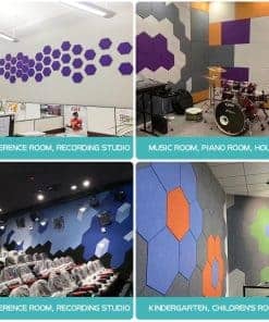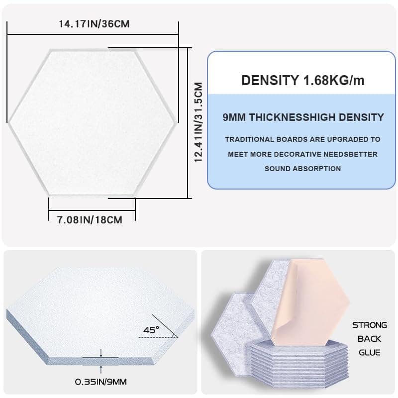 Transforma tu espacio en un área acústicamente mejorada con los 24 Paneles Acústicos Hexagonales de QINGFANGLI. Estos paneles de espuma insonorizante autoadhesivos están diseñados para proporcionar una absorción de sonido efectiva, haciéndolos ideales para su uso en estudios de grabación, oficinas, cines en casa y más. El método de pelar y pegar fácil de instalar garantiza un proceso de instalación sin complicaciones, sin necesidad de herramientas adicionales. Con una forma hexagonal única y un diseño biselado, estos paneles no solo mejoran la calidad acústica, sino que también añaden un toque de elegancia a cualquier habitación. Hechos de fibra de poliéster de alta densidad con una densidad de 250 kg / metro cúbico, estos paneles tienen un coeficiente de absorción de ruido (NRC) de 1.3, absorbiendo efectivamente los sonidos de alta frecuencia generados por voces humanas o dispositivos electrónicos. También se pueden combinar con trampas de baja frecuencia para absorber un rango más amplio de frecuencias. Nuestros materiales insonorizantes son ecológicos y seguros al tacto y al respirar, sin olor desagradable. Ya sea que estés buscando reducir el eco en tu estudio de grabación o crear un espacio de trabajo más tranquilo en casa, estos paneles de espuma insonorizante ofrecen la solución perfecta. Elige entre una variedad de colores para crear tus propias combinaciones DIY y disfruta de una mejor calidad de sonido con un toque de estilo.