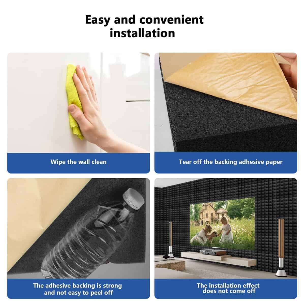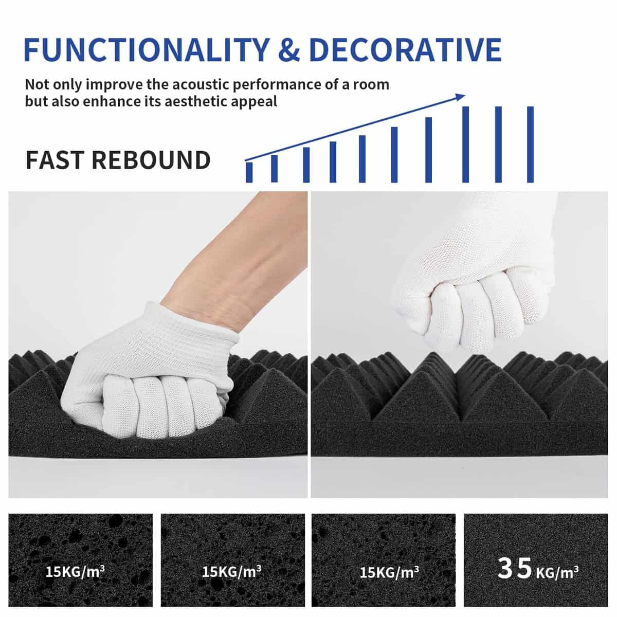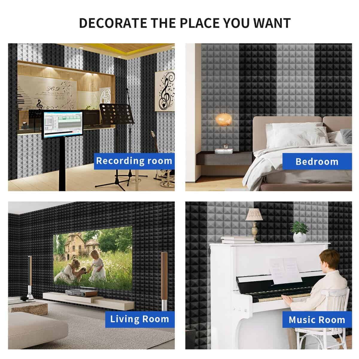 24 Pack de Paneles Acústicos Piramidales de 12″ X 12″ X 2″ con Autoadhesivo. Tecnología de Expansión Rápida, Rendimiento Acústico Superior, Instalación Sencilla, Construcción de Alta Densidad, Diseño Versátil para Funcionalidad y Estilo.
