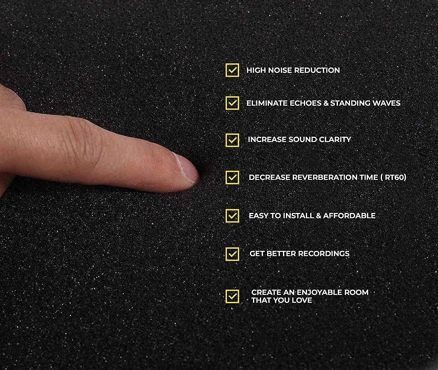 Efectivo contra ondas estacionarias y ecos intermitentes en la mayoría de las habitaciones pequeñas a medianas. NRC global: 0.4 Para uso en cabinas vocales, salas de control y estudios. Nuevo Azulejo de Espuma Acústica Fabricado por Espuma de Alta Calidad Importada Espuma Absorbente de Sonido Estructura celular de espuma acústica de alta densidad para una absorción máxima de ruido Ayuda a reducir los ecos intermitentes y a reducir las reflexiones y reverberaciones excesivas Mejora la claridad vocal y la acústica de su habitación Ideal para su uso en estudios de grabación, teatros en casa y salas de karaoke