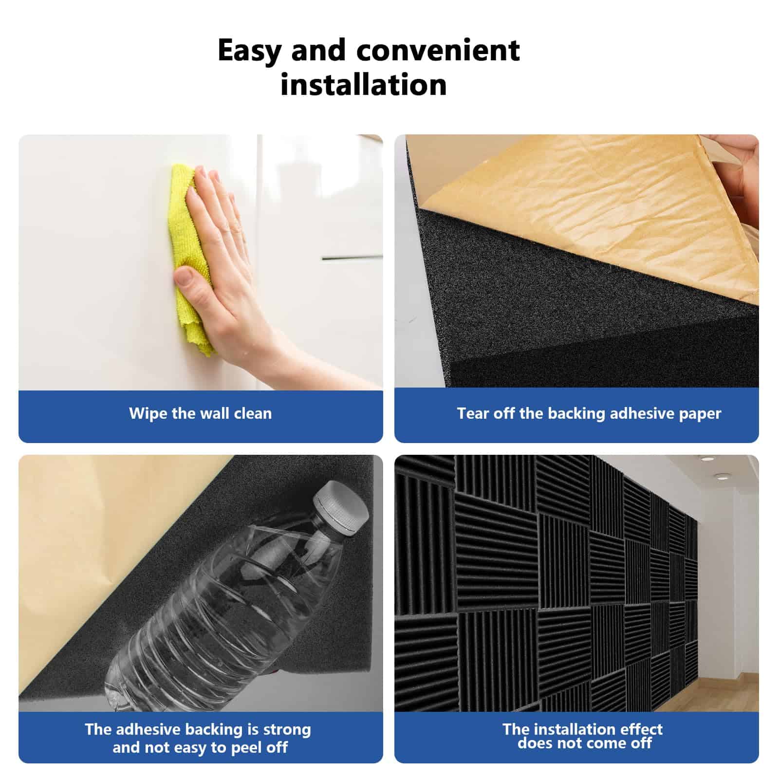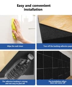 3. Instalación Sencilla con Autoadhesivo: Transformar tu espacio nunca ha sido tan fácil. Nuestros paneles de espuma para pared a prueba de sonido vienen equipados con un conveniente respaldo autoadhesivo, permitiendo una instalación rápida y sin complicaciones. Crea tu configuración ideal a prueba de sonido sin necesidad de herramientas adicionales o experiencia.