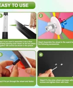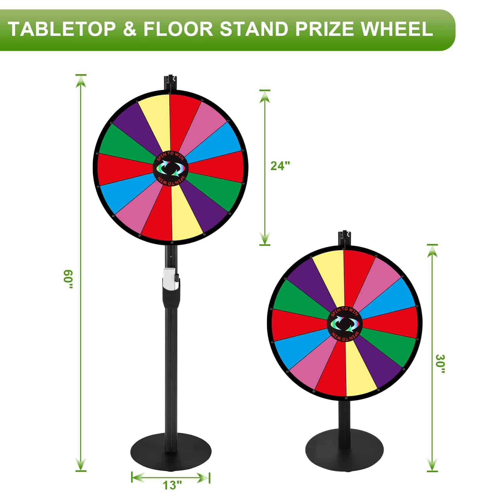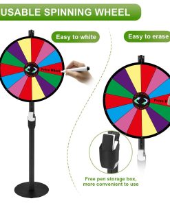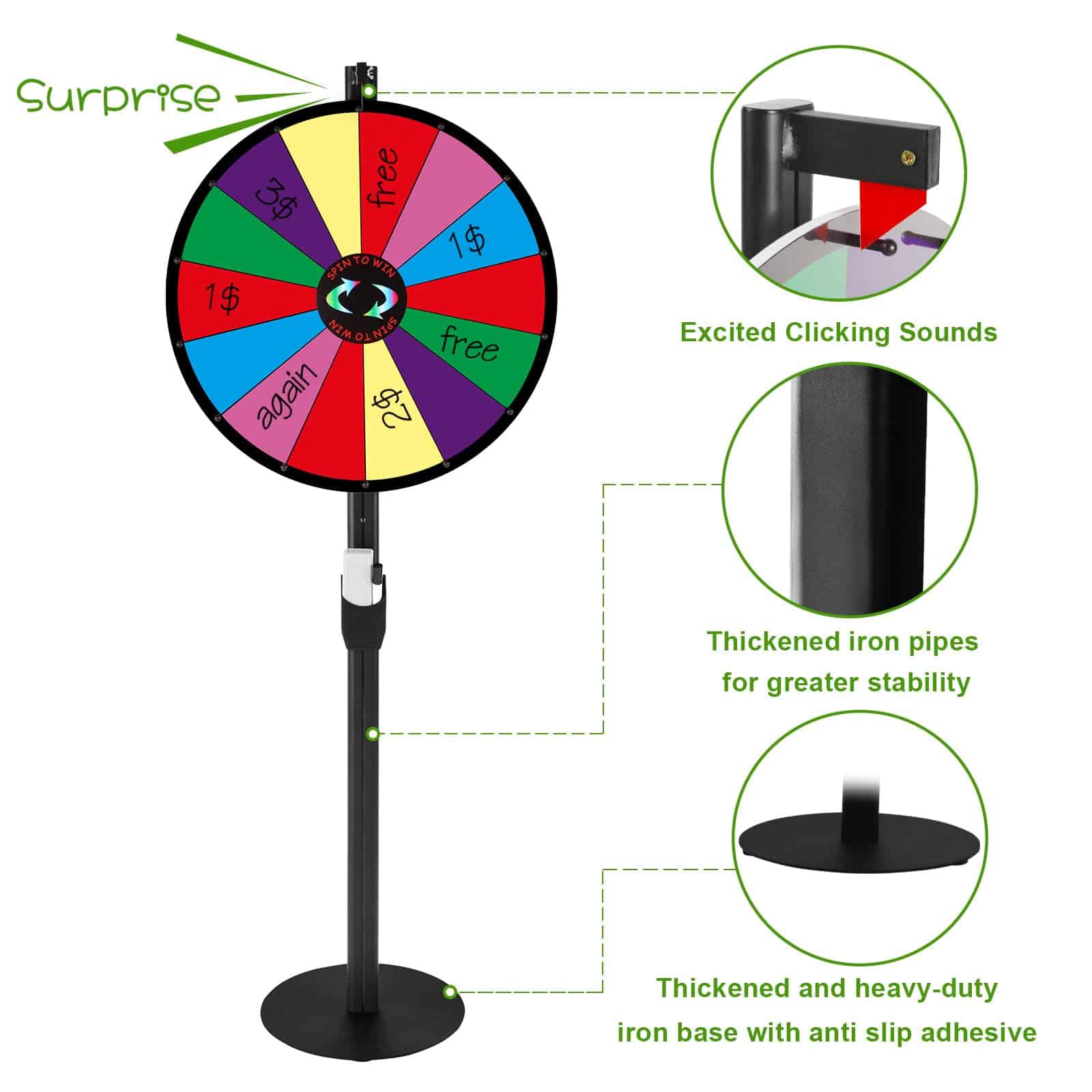 Nuestra ruleta de premio de color de 24″ de uso dual (Mesa/Soporte de Piso) tiene 14 ranuras habilitadas para personalización de color y viene con una superficie de borrado en seco para texto. Puedes escribir en la ruleta de premio con tu mensaje personalizado o dejarlo en blanco. Además, nuestra ruleta de premios está hecha para durar. Utilizamos materiales de alta calidad, bases de hierro engrosadas. Doble rodamientos de bolas de precisión para girar suavemente. Los sonidos de «clic» ayudan a agregar emoción y atraen multitudes. Nuestra ruleta fue diseñada para ser robusta y confiable y perfecta para centros comerciales, actividades navideñas, carnavales, ferias comerciales, reuniones anuales y fiestas, etc. Nos comprometemos a proporcionar a cada cliente el más alto nivel de experiencia de compra.