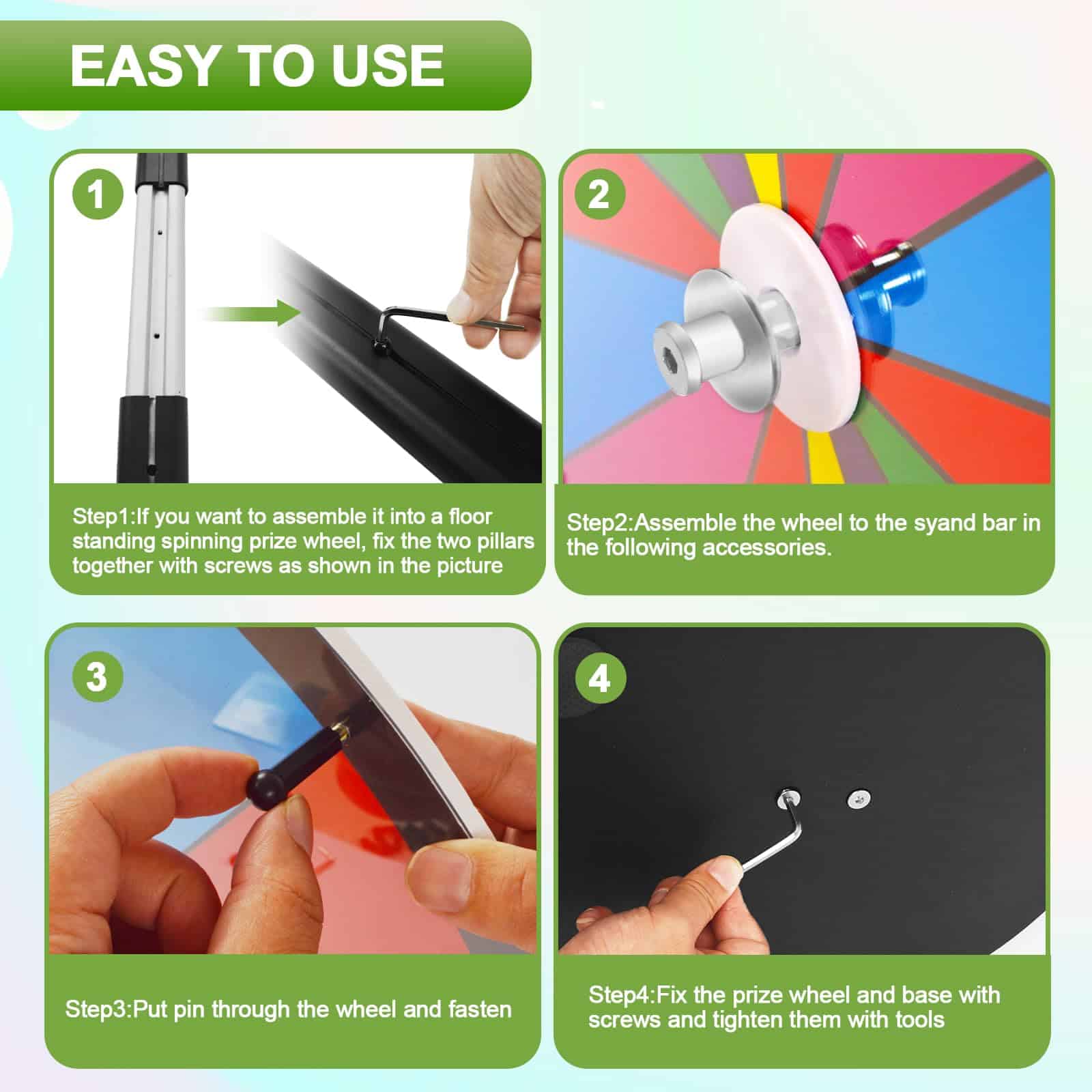Uso dual-2 en 1 Soporte y poste de servicio pesado. Doble rodamientos de acero inoxidable para un giro suave y equilibrado. Clavijas de acero inoxidable duraderas y atractivas. ¡Controla la duración de tu giro! Garantía de mano de obra de un año. 14 ranuras Color personalizable para texto. Tablero acrílico de borrado en seco: más fácil de limpiar, mayor dureza, más resistente al desgaste. Los sonidos de «clic» agregan emoción y atraen multitudes. Soporte desmontable para un almacenamiento fácil y un montaje conveniente.