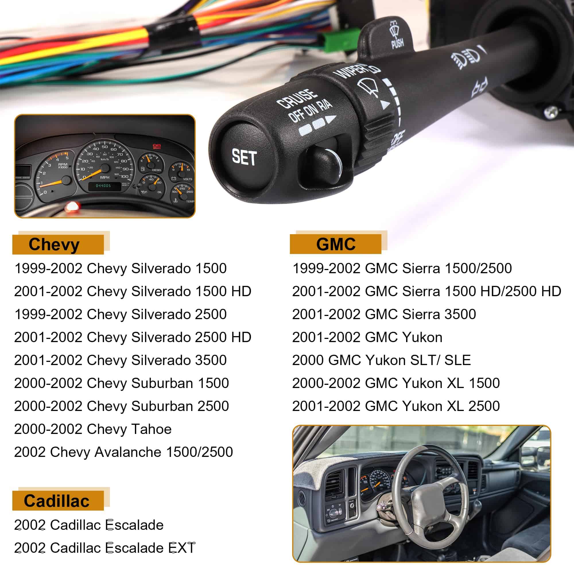 El interruptor de señal de giro y control del limpiaparabrisas multifunción 26100839 es un reemplazo compatible con varios modelos de vehículos Chevy, GMC y Cadillac. Se adapta a Chevy y GMC 1500 2500 del año 1999-2002, 3500 del año 2001-2002, Suburban 1500 & 2500 del año 2000-2002, Tahoe & Yukon del año 2000-2002, Avalanche del año 2002, Escalade del año 2002 y más. Este interruptor reemplaza directamente las partes 26100839, 3441937, CBS-1038, 26090412, 629-00312, AM-26660736, ofreciendo un rendimiento superior y una vida útil prolongada. Fabricado con plástico ABS y PP de alta calidad, este interruptor es duradero y resistente. La instalación es sencilla, solo necesita quitar el interruptor original y reemplazarlo con este nuevo. Controla varias funciones importantes, como las luces de emergencia, señal de giro, intermitentes, limpiaparabrisas, lavaparabrisas y luces altas. Con una política de devolución e intercambio de 1 año, nos comprometemos a brindar un excelente servicio al cliente y satisfacción. Si tiene alguna pregunta o inquietud, no dude en ponerse en contacto con nosotros, estamos aquí para ayudarle.