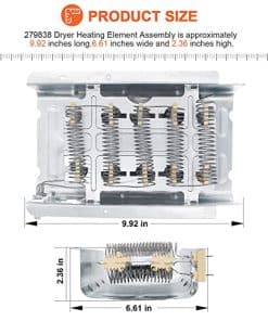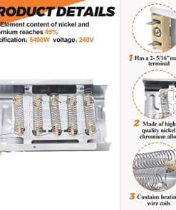 DESCRIPCIÓN DEL PRODUCTO: Conjunto de elemento calefactor para secadora. 5400 vatios 240 voltios. Hecho de materiales de alta calidad, rigurosamente probado, con la mejor calidad y precio razonable, instalación fácil, puede solucionar el problema de la secadora en menos de 30 minutos. PAQUETE INCLUYE: 1 Conjunto de elemento calefactor para secadora. FIJA LOS SIGUIENTES SÍNTOMAS: no produce calor, no se enciende, tarda demasiado en secar, se apaga demasiado pronto. FUNCIONA CON LA MAYORÍA DE LAS MARCAS: Admiral, Amana, Crosley, Estate, Inglis, Kenmore, Roper, Whirlpool. FUNCIONA CON LOS SIGUIENTES NÚMEROS DE MODELOS: Kenmore: 11096560200, 1037777000, 1037777020, 1037777040, 1037777060, 1038017050, 1038517050. Whirlpool: LEB6300PW0, LEB6300PW1, LEC7646DQ0, LEC7646DQ1, LEC7646DZ0, LEC7646DZ1, LEC8858EZ2, LEL8858EQ1, LEN2000JT1, LEN2000KQ1, LEN2000PG1, LEN2000PW1, LEN3624BN2, LEN3624BW2, LEN3634DW0, LEN3634DW1, LEQ5000KQ0, LEQ5000KQ1. Crosley: CEDX463JQ0, CED126SBW1, CED126SXQ0, CED126SXQ1, CED137HXQ0, CED137HXW0, CED137SBW0, CED137SDW0, CED147HXW0, CED147SBW0, CED147SDW0, CEDS1043VQ0, CEDS1043VQ1, CEDS563MQ0, CEDS563MQ1, CEDS563RB1, CEDS563RQ1. TENGA EN CUENTA: Tenga en cuenta que las piezas de electrodomésticos pueden parecer similares de muchas maneras. Si no está seguro de si una pieza que está ordenando se ajusta a su modelo, por favor envíenos un correo electrónico antes de realizar el pedido. Incluya su número de modelo y número de serie. Podemos verificar si la pieza se ajustará a su modelo.