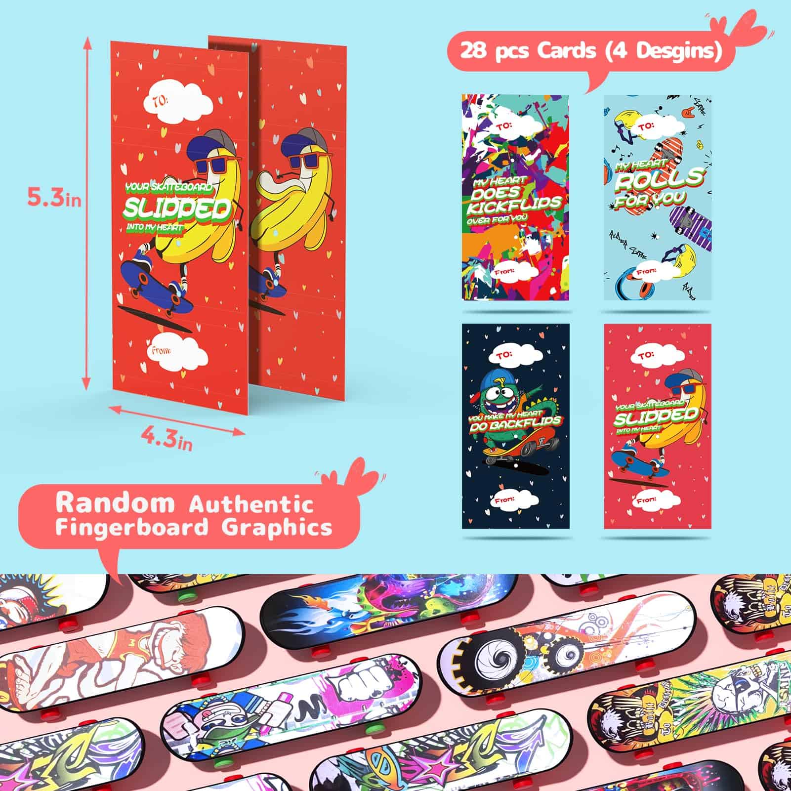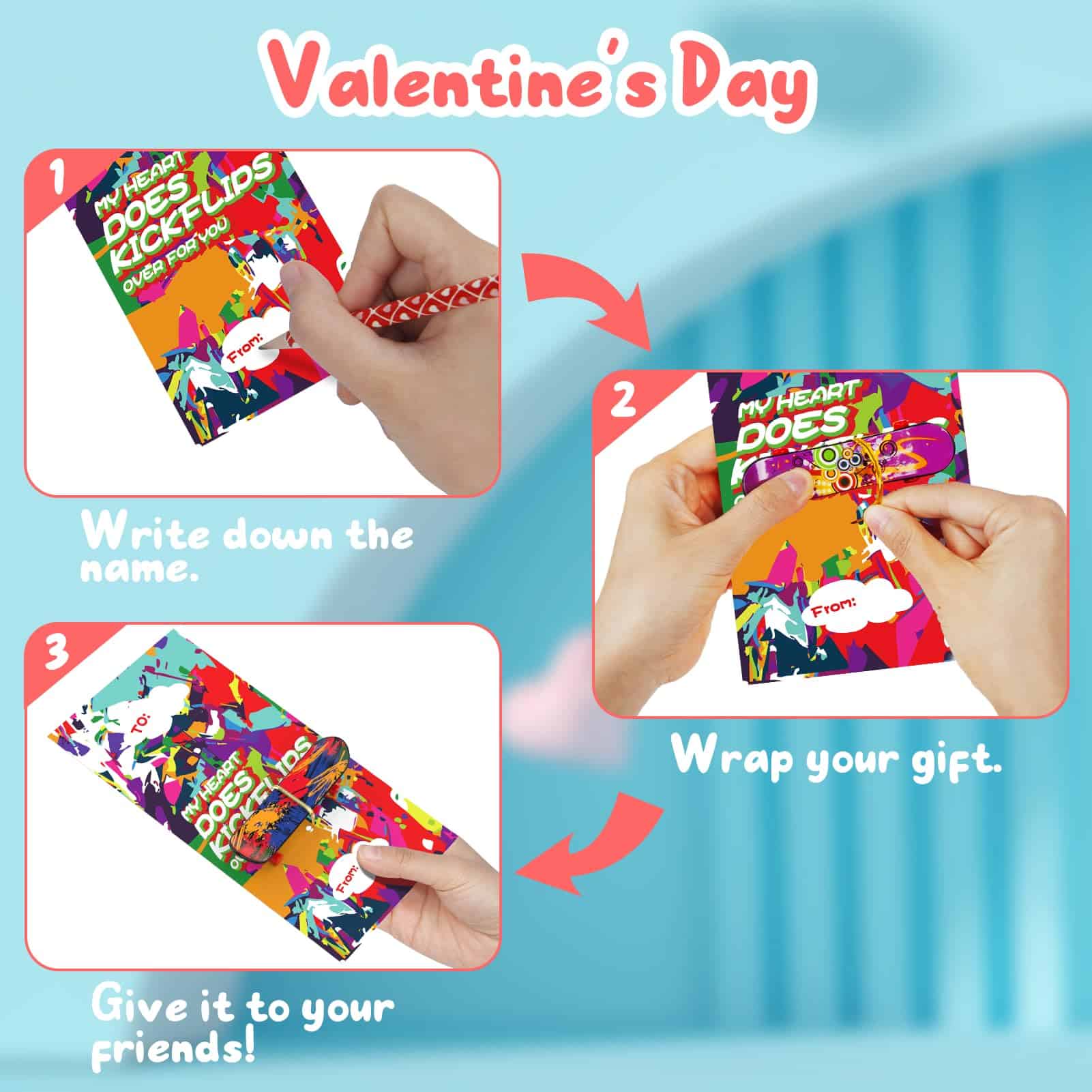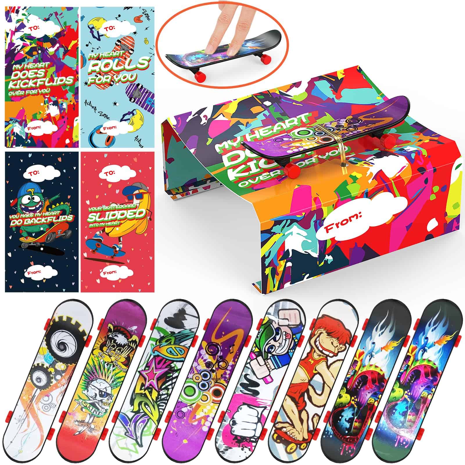 2. Regalos de San Valentín ideales: Los mini skateboards para dedos son juguetes ideales para que los niños disfruten. Deja que tus hijos o estudiantes tengan un San Valentín perfecto con nuestros finger skateboards de San Valentín y tech deck. Los finger skateboards también pueden ser un regalo ideal para tus compañeros de clase, estudiantes, colegas, miembros de la familia y más.