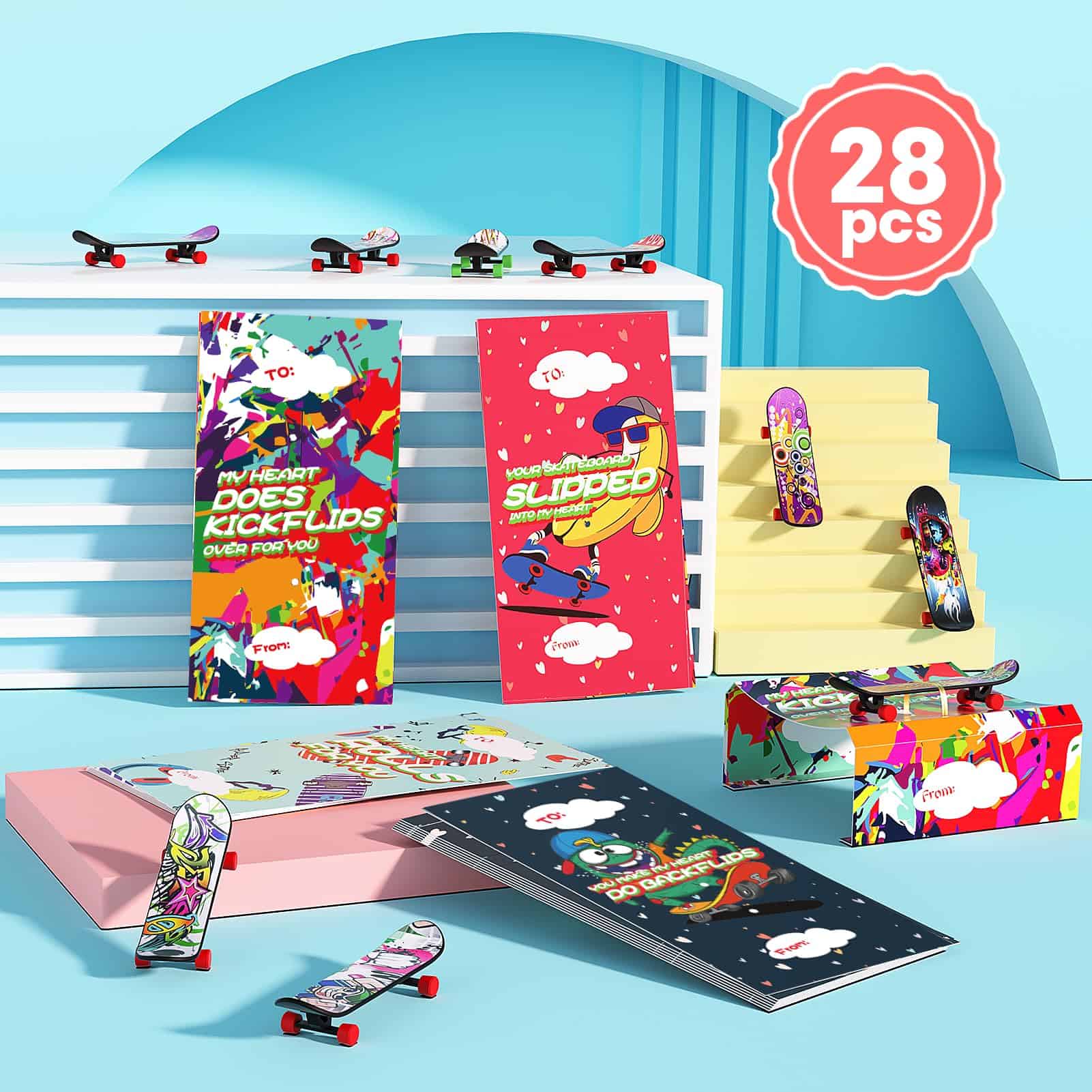 1. Paquete de súper valor: El set de regalos de San Valentín con Finger Skateboard incluye 28 tarjetas en 4 diseños y 28 finger skateboards. Viene con todo lo que necesitas para hacer excelentes regalos de San Valentín para el intercambio de San Valentín de los niños en la escuela.