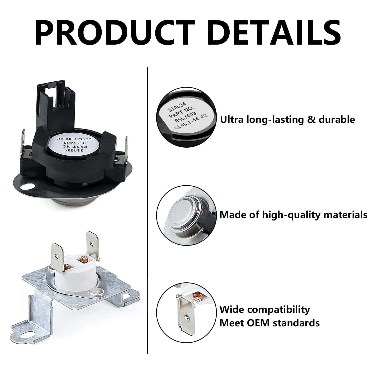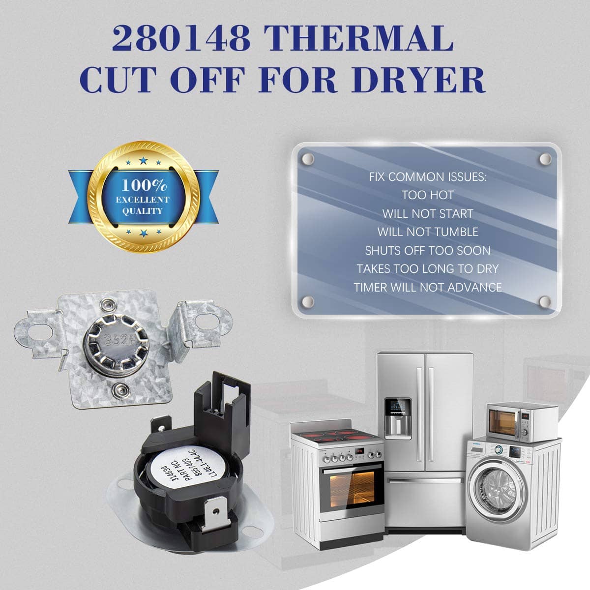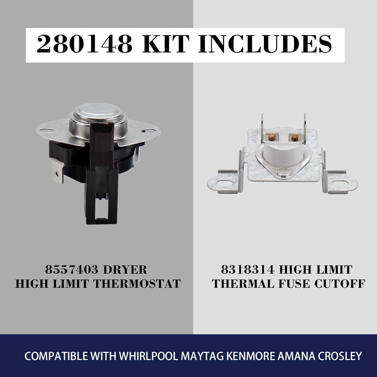 El kit de corte térmico 280148 para secadora incluye un termostato de límite alto 8557403 y un fusible térmico de corte 8318314. Por favor, reemplace las partes juntas debido a la interacción entre las dos partes. Ampliamente aplicable, este kit de reemplazo de fusible térmico es adecuado para secadoras Whirlpool, Maytag y Kenmore, modelos WED7300XW, WED7400XW, WED7400XW0, MED5500FW2, MED5630HC0, etc. Soluciona problemas como falta de calor, demora en secado, apagado prematuro o problemas con el temporizador. La calidad premium del kit garantiza durabilidad y eficiencia superiores, con instalación rápida y fácil. Compra con confianza con Funmit, que ofrece la mejor calidad de piezas y servicio al cliente. Si experimentas algún problema de calidad durante el período de garantía, contacta a nuestro equipo de atención al cliente para resolverlo rápidamente